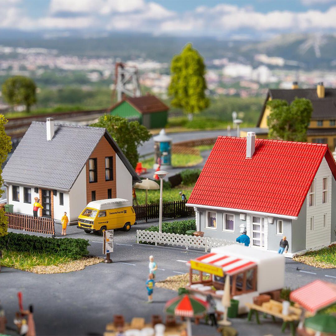This charming double pack brings two detached houses to your model railway layout: The first impresses with wooden wall accents, terrace and grey tiled roof. The second house sets further modern accents with its grey and white façade, elegant covered terrace and red tiled roof. Both models are easy to build and ideal for beginners – double the fun in miniature format!