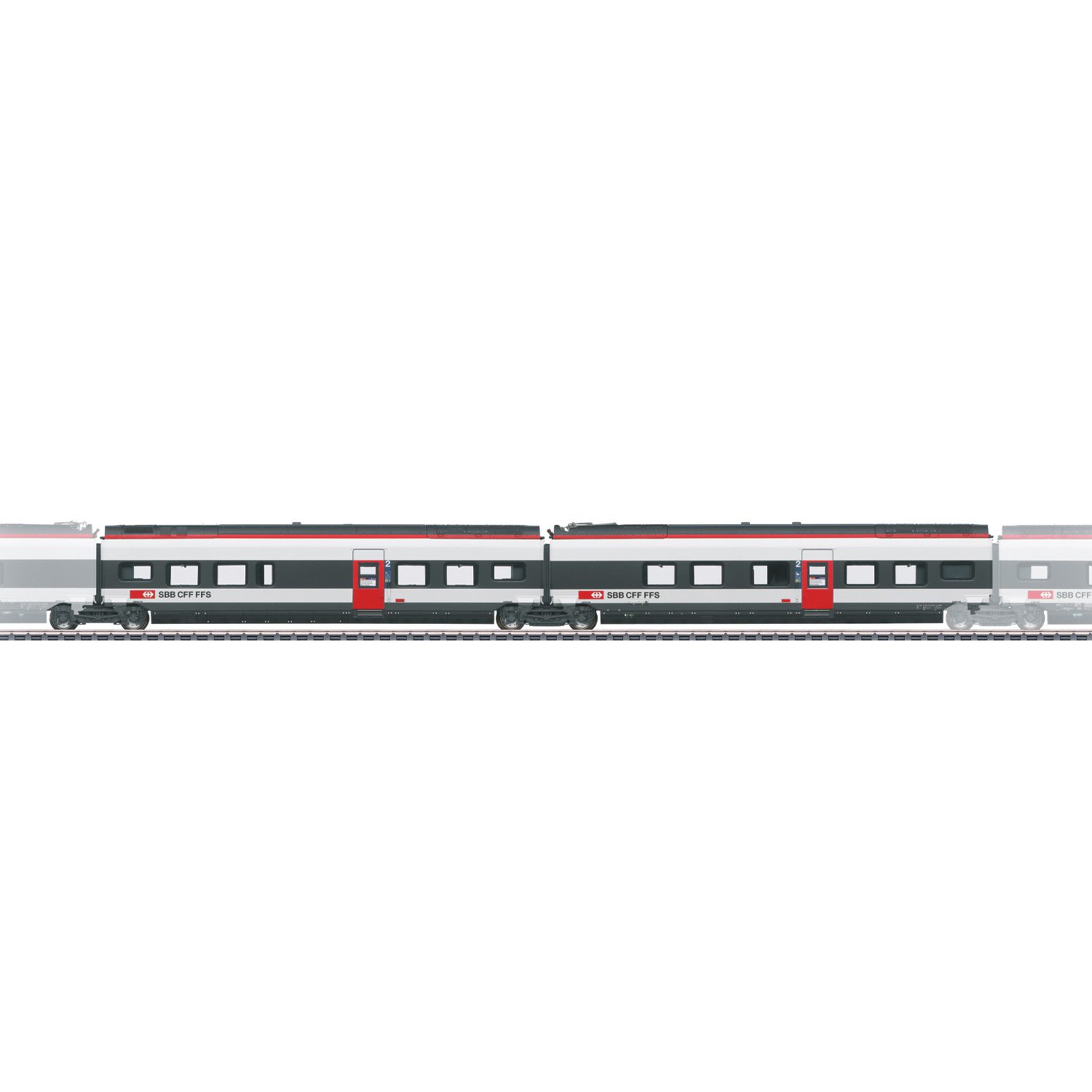 Add-on cars for the Swiss Federal Railways (SBB) class RABe 501 “Giruno” high-speed powered rail car train. 1 type B (B11) intermediate car, 2nd class, with a pantograph. 1 type C (B10) intermediate car, 2nd class. The cars go with train number EC 151, with cross border train route: Frankfurt/Main – Freiburg – Basle – Zürich – Milan Central. Train number RABe 501 022 with the coat of arms for the Swiss canton Vaud. The cars look as they did around 2024.