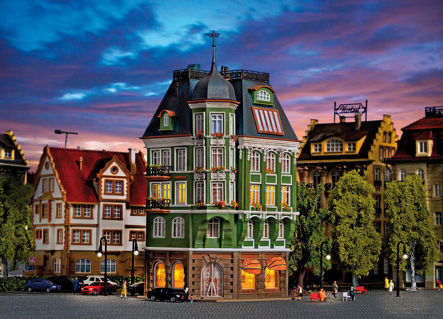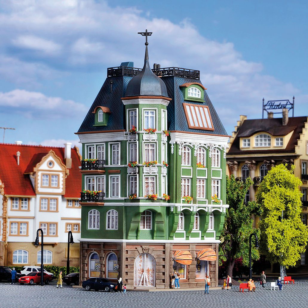 Special construction offers that each side is a face side. So e.g. 2 different houses can set side by side and appears different. Using the included cover sheets you can set one building to another building. The house is equipped with more details, e.g. iron lattice ornaments as decoration, filigree balcons, stucco facades. Dimensions: L 8,5 x W 7,5 H 18 cm.