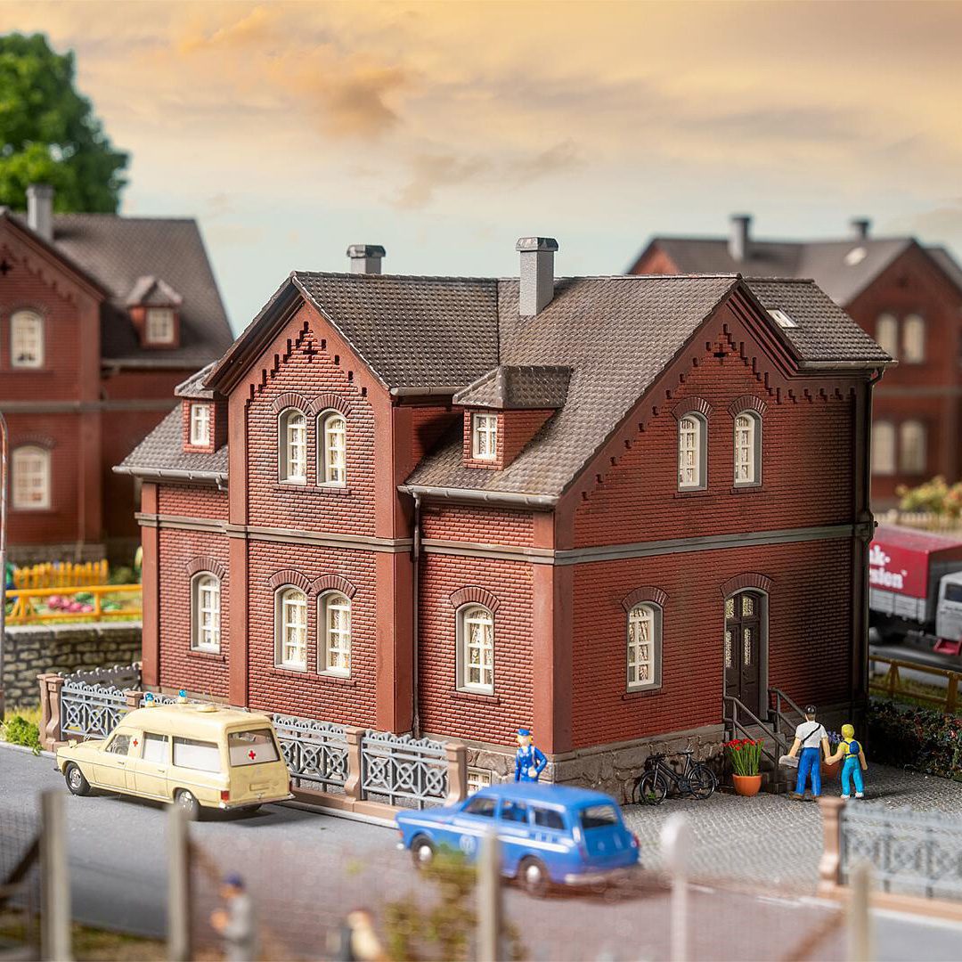 A touch of the Ruhr region for your model world: The brown estate house with classic pitched roof and characteristic brick elements is inspired by the historic workers’ houses of the listed Bergmannsplatz colliery estate in Duisburg-Neumühl. As part of the Route of Industrial Heritage, it tells of hard work and living history – an ideal model for anyone who wants to give their property an authentic, industrial flair.