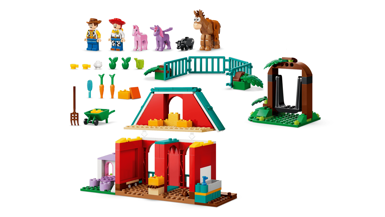 • BARN, PLAYHOUSE AND TREE SWING – This Blaze’s Horse Ranch (43304) building toy includes 6 LEGO® ǀ Disney and Pixar characters, a barn with opening gates, tree swing, playhouse, horse pen and more
