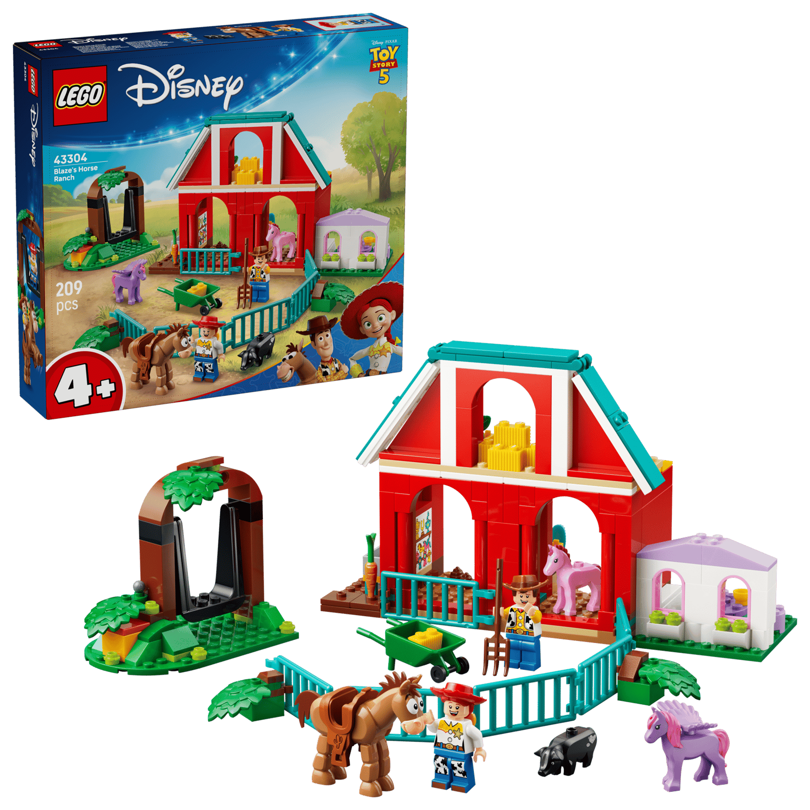 Wild West-style adventures await kids ages 4 years old and up in this LEGO® ǀ Disney and Pixar Toy Story 5 Blaze’s Horse Ranch (43304) building toy. This barn toy building set, inspired by Toy Story 5, sparks play with 6 LEGO® ǀ Disney and Pixar characters: Woody and Jessie minifigures, Bullseye the horse, Blaze’s pet pig, a pony and a winged horse. There’s a barn with gates, a hayloft, playhouse, veggie patch and watering trough, and a tree swing with hidden time capsule. This buildable preschool toy for girls or boys 4 years old and up makes a cool Toy Story gift-giving idea for a birthday or holiday. Create the build alongside other LEGO ǀ Disney building toys (sold separately) to encourage play. It has colorful pictorial instructions, large Starter Bricks and separate bags holding 1 brick-built model each to make building fast and fun. Plus, with the LEGO® Builder app, kids can zoom, rotate in 3D and track progress with easy-to-follow digital instructions. Set contains 209 pieces.