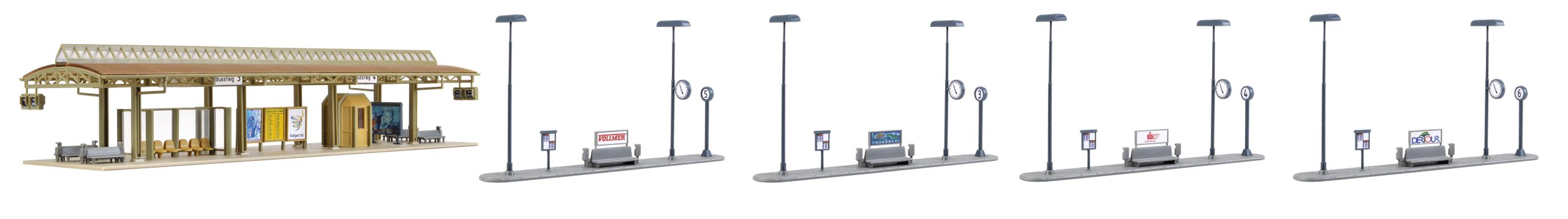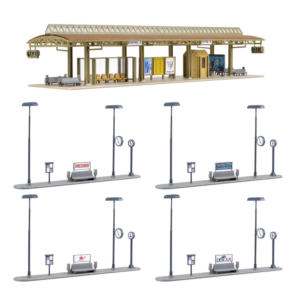 This modern bus station is very busy. The buses arrive from suburbs, taking passengers to the main station or from here to the city. This modern bus station has a kiosk, benches, timetables and a lighting (without function). Dimensions: L 27.7 x W 8 x H 6.2 cm / L 15 x W 2 x H 7.5 cm