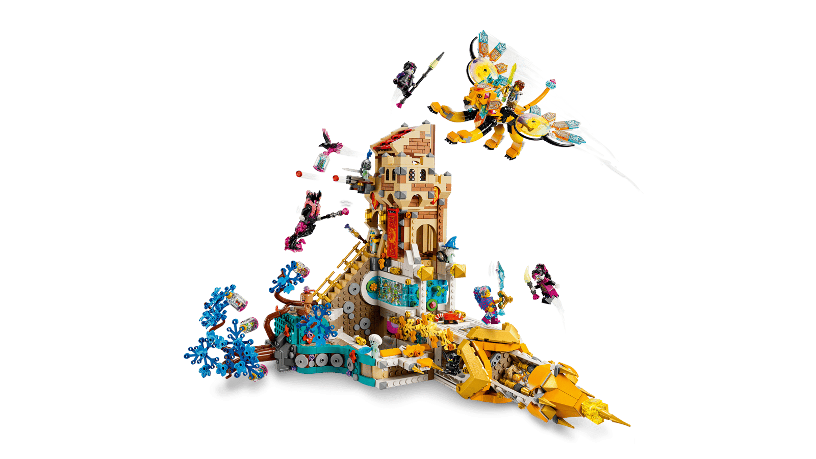 The adventure is brought to life by a cool manticore figure and 6 minifigures: Mateo and Izzie, their dark doppelgangers MadTeo and Dizzy, Mrs. Castillo and the Never Witch. Each minifigure has 2 facial expressions and the set includes story-led building instructions that encourage kids to immerse themselves in the action as they enjoy hours of imaginative play.