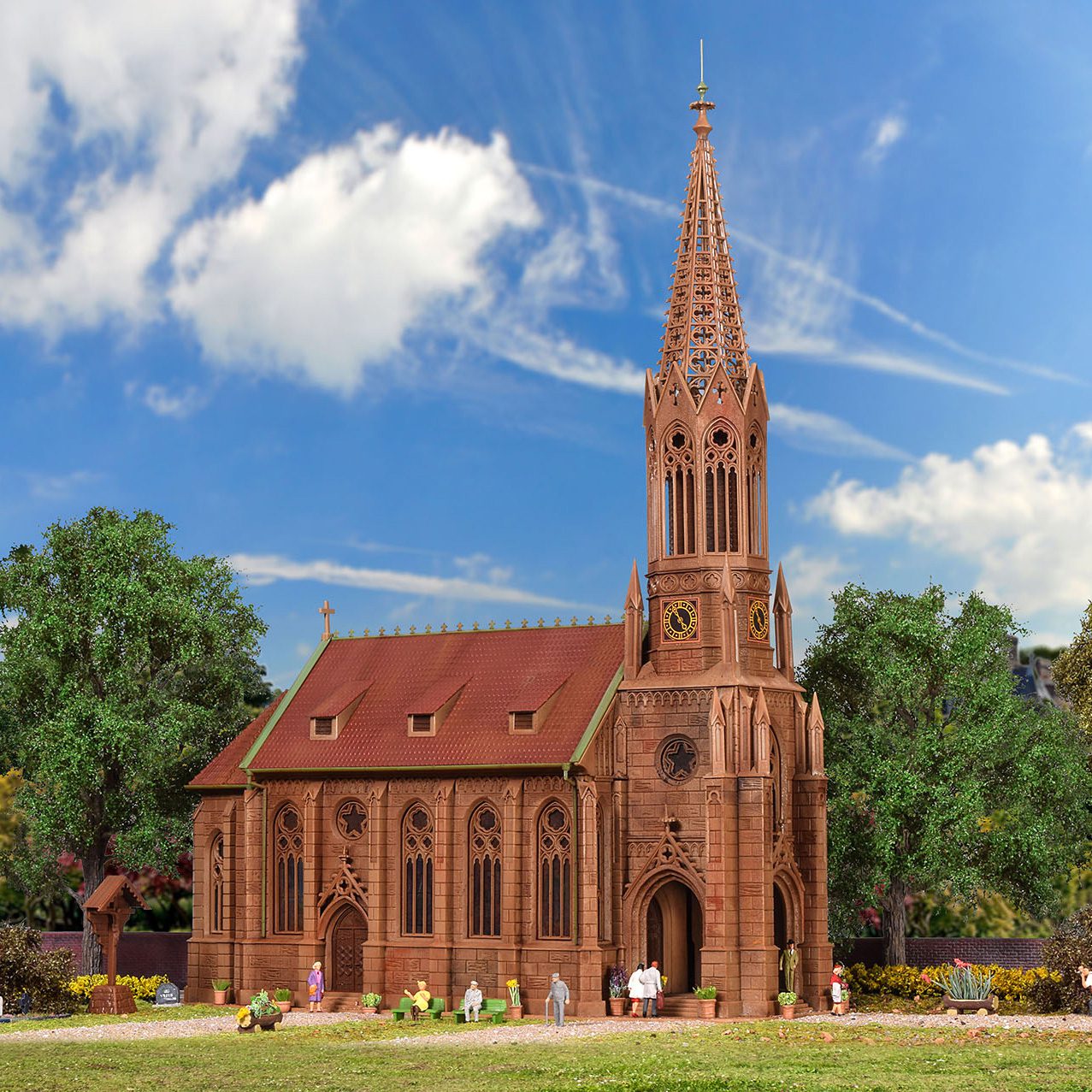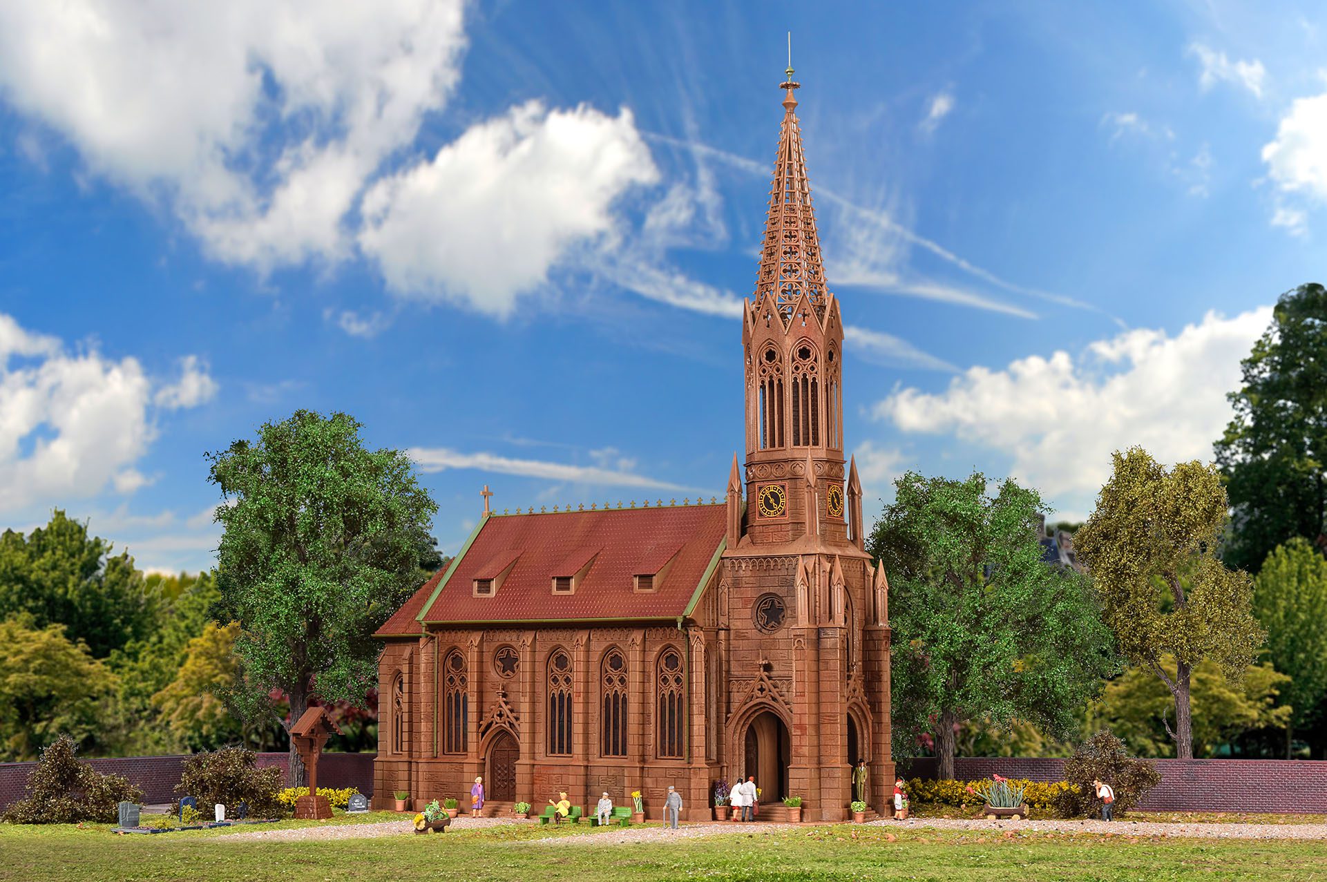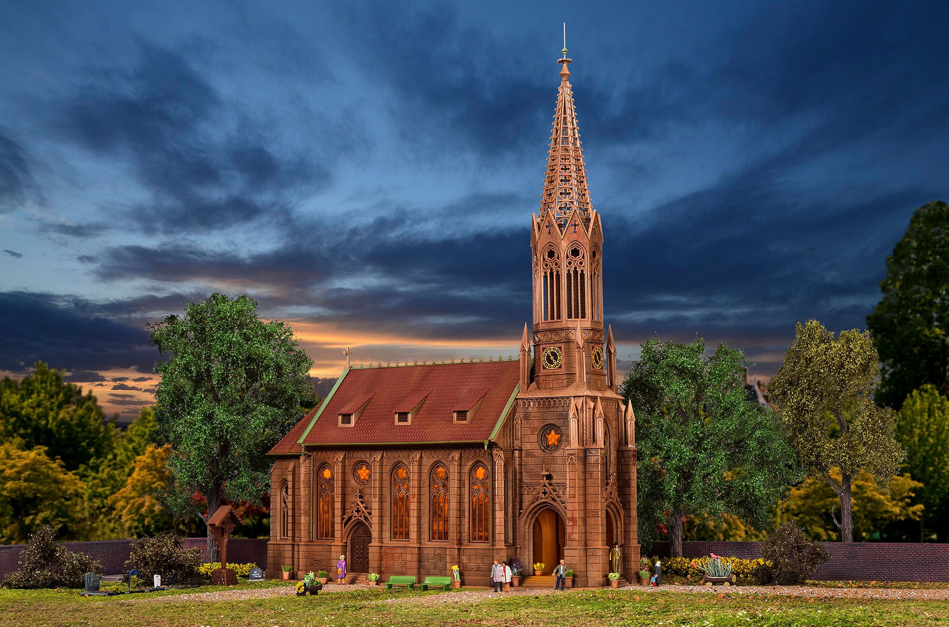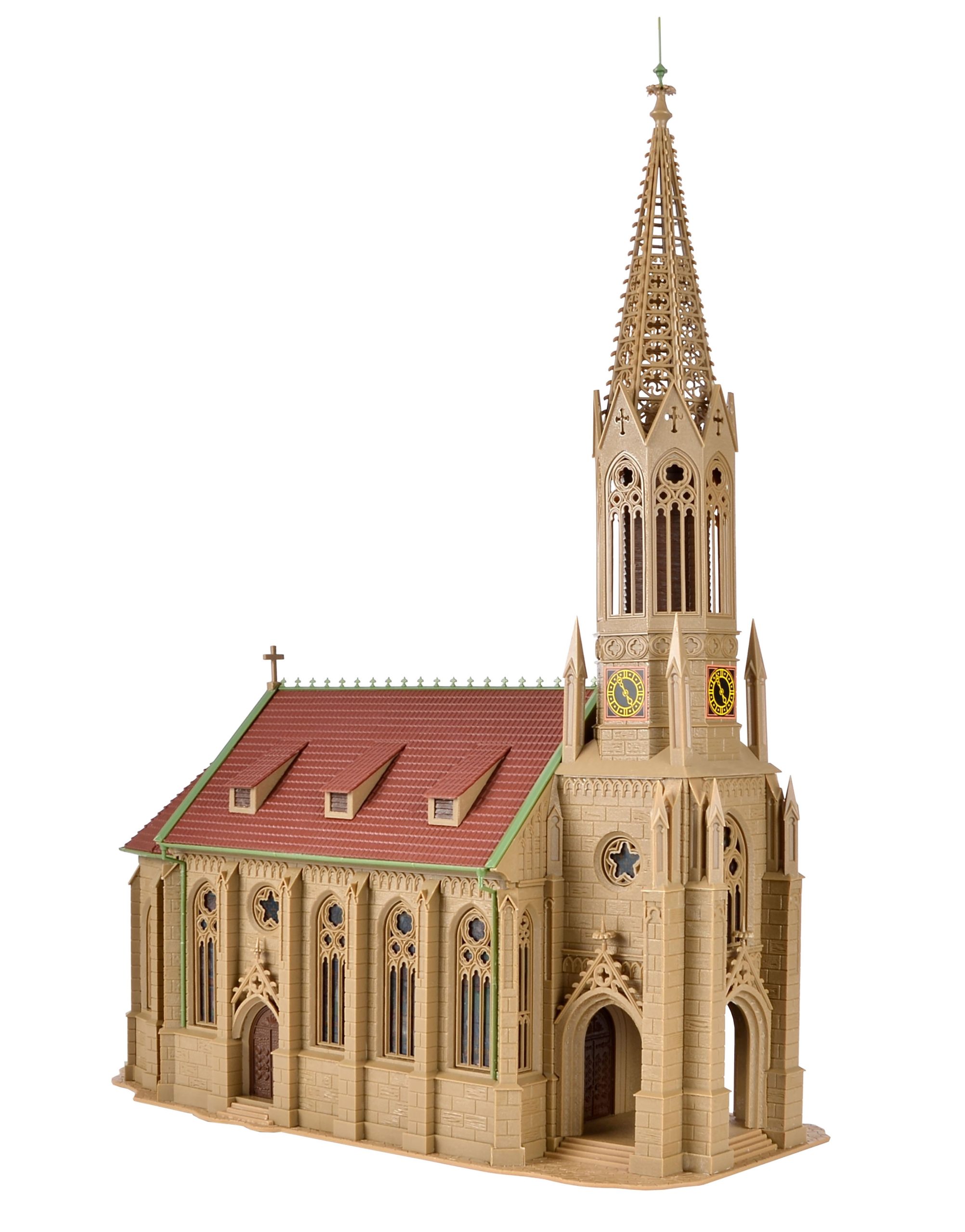 Church Stuttgart-Berg stands in an elevated position above the west bank of the Neckar river. Ancient manuscripts record that the church existed as early as 1235. The new Gothic church, which is the basis for the Vollmer kit, was built in 1853 – 55. The church was destroyed in 1944. The restoration was accomplished in 1954 – 55. Dimensions: L 30 x W 13 x H 39 cm. Suitable for item 43738 church staircase Stuttgart-Berg.