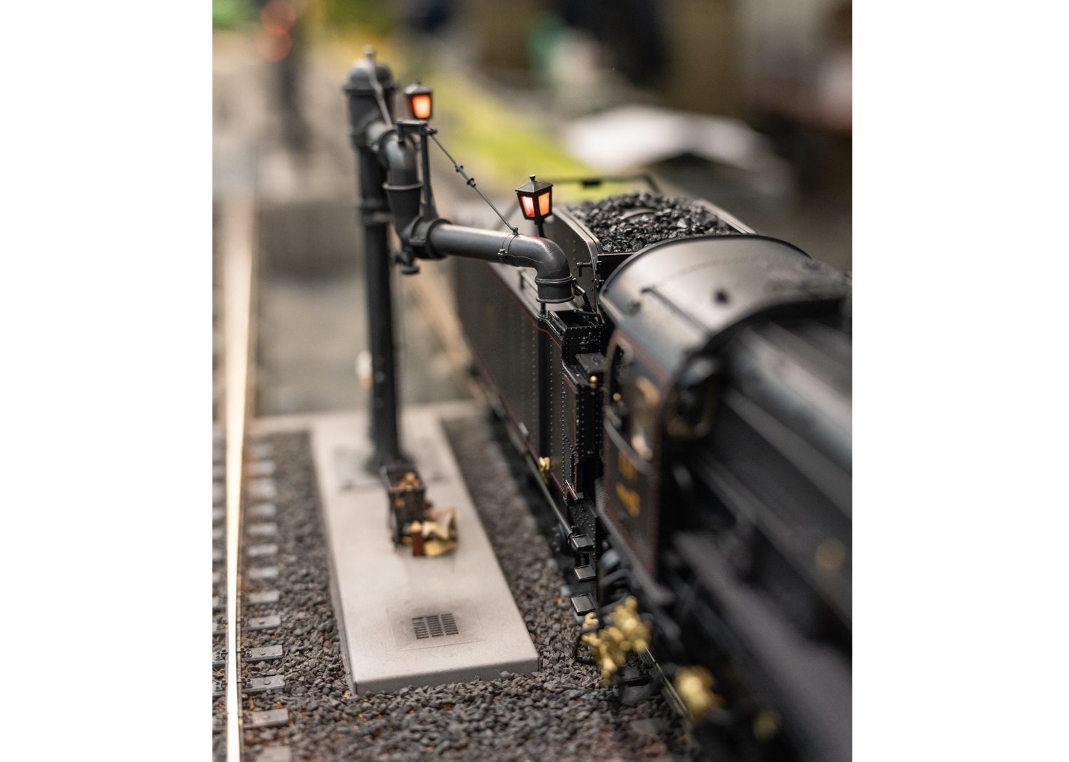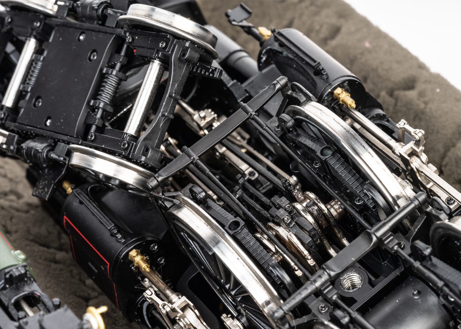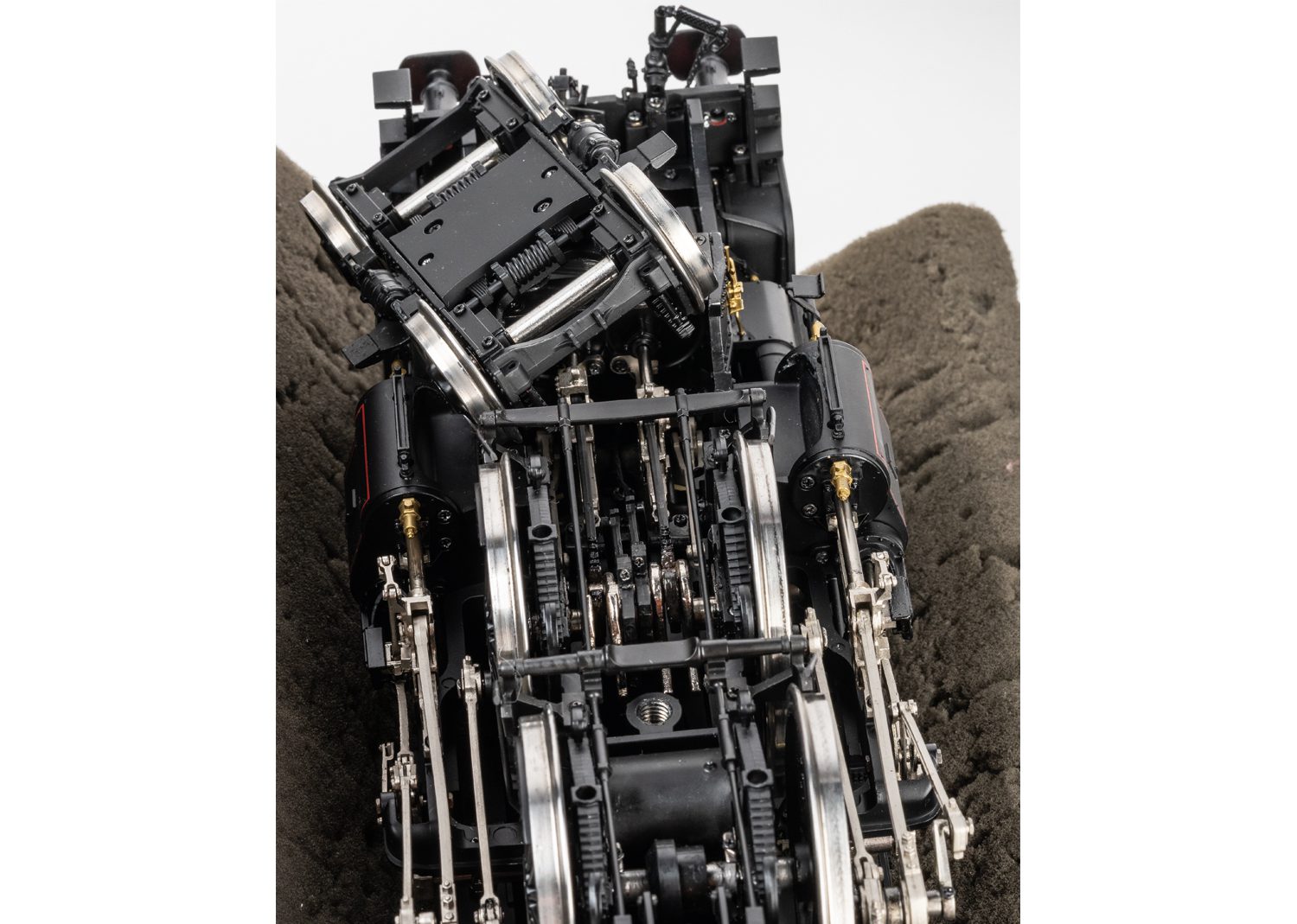 The locomotive has a red marker light that can be controlled. The locomotive has cab lighting and multi-colored firebox lighting (flickering). The locomotive comes with sprung buffers. There is a reproduction of the prototype coupler on the front and a remote-controlled Telex coupler on the rear of the tender, which can be replaced by either of the other types of coupler. The valve gear switchover is in 3 steps (forward, reverse, continuous operation).