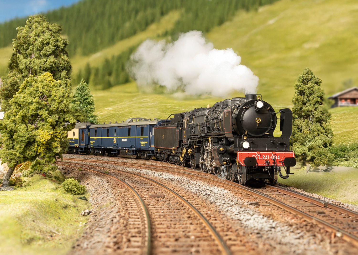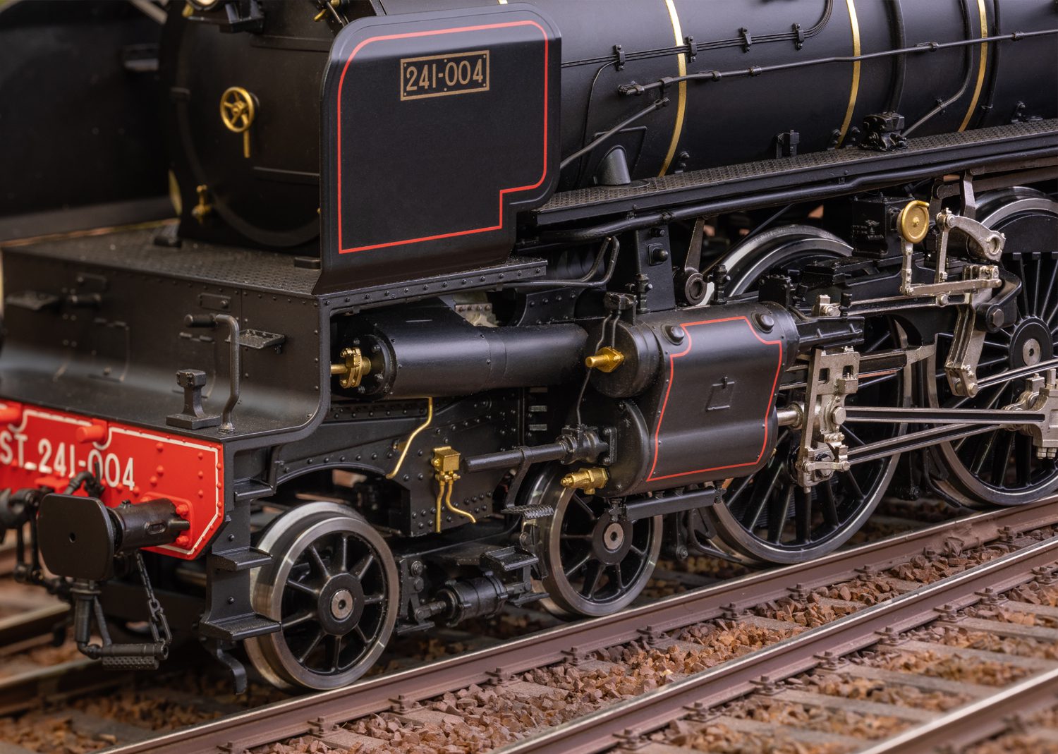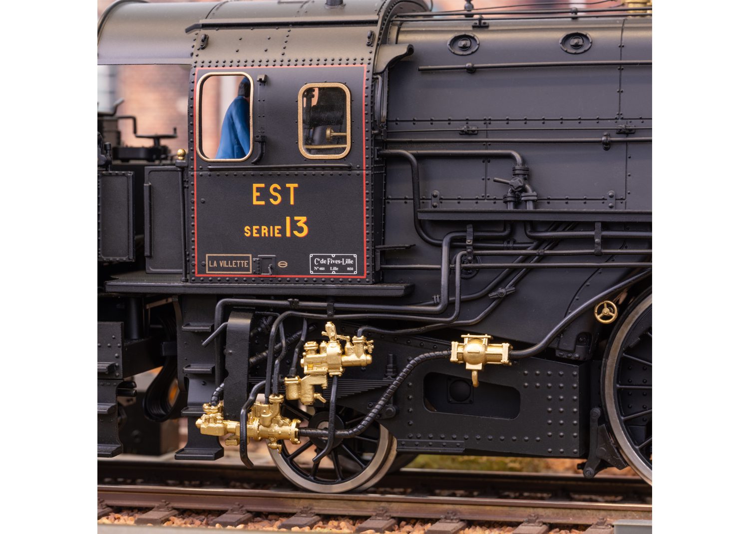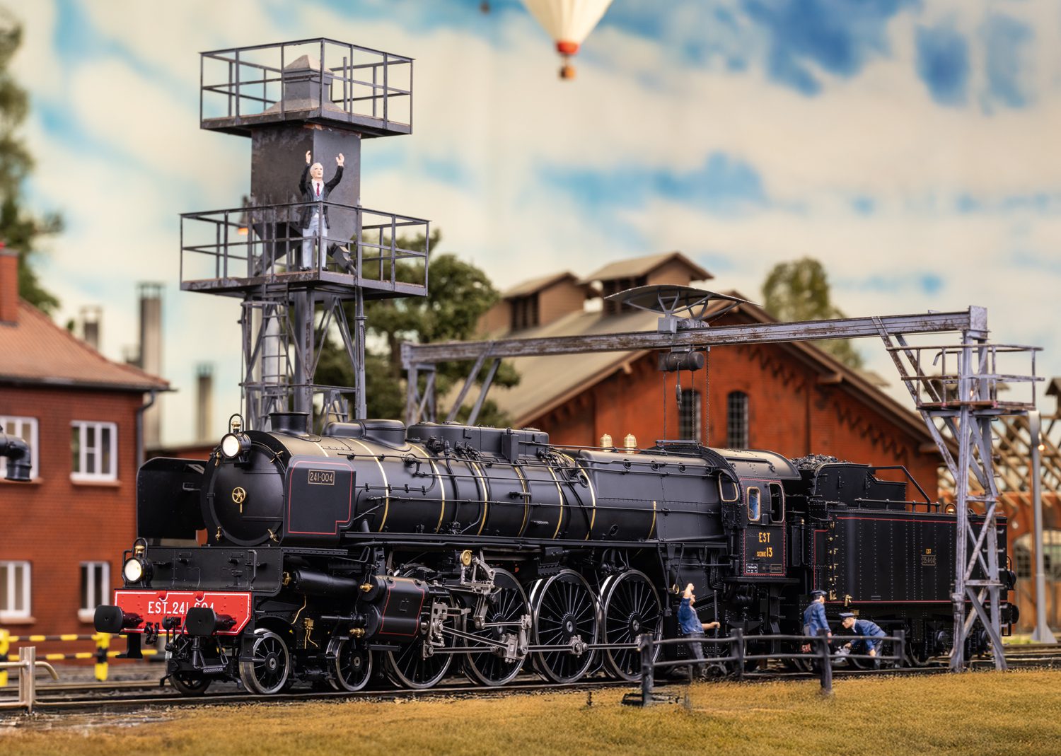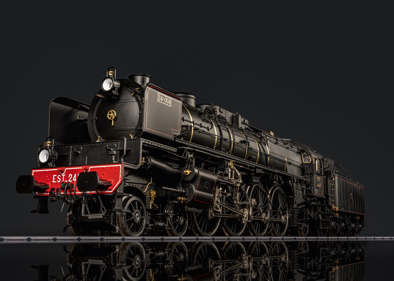 French East Railroad (EST) class 13 (241-A) heavy express train steam locomotive with a tender. Black basic paint scheme with a black frame. Version as a locomotive for the “EDELWEISS” express train passenger car set. Changes to the smoke deflectors specific to the type. Dual headlights with kerosene lamps, with one lamp above and one lamp below. Road number EST 241 004. The locomotive looks as it did around 1931.