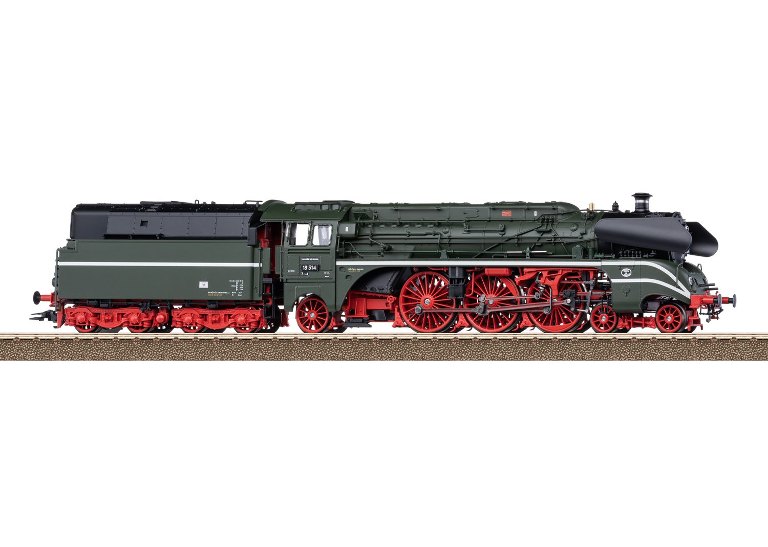 The locomotive has a digital decoder and extensive sound functions. It also controlled high-efficiency propulsion with a flywheel, mounted in the boiler. 3 axles powered. Traction tires. The locomotive and tender are constructed mostly of metal. There is a factory-installed smoke unit, speed-dependent dynamic smoke exhaust. The triple headlights change over with the direction of travel, will work in conventional operation, and can be controlled digitally. There are also two digitally controlled red lamps at the front of the locomotive. The cab lighting and the running gear lights can be controlled separately in digital operation. Maintenance-free warm white and red LEDs are used for the lighting. There is a buffer capacitor. There is a close coupling with a guide mechanism between the locomotive and the tender. There is a close coupler with a guide mechanism and an NEM pocket on the tender. The minimum radius for operation is 360 mm / 14-3/16″. Streamlining without a wheel cutout for installation beneath the cab is included for large radius curves or a display case. Piston rod protective sleeves and brake hoses are also included.