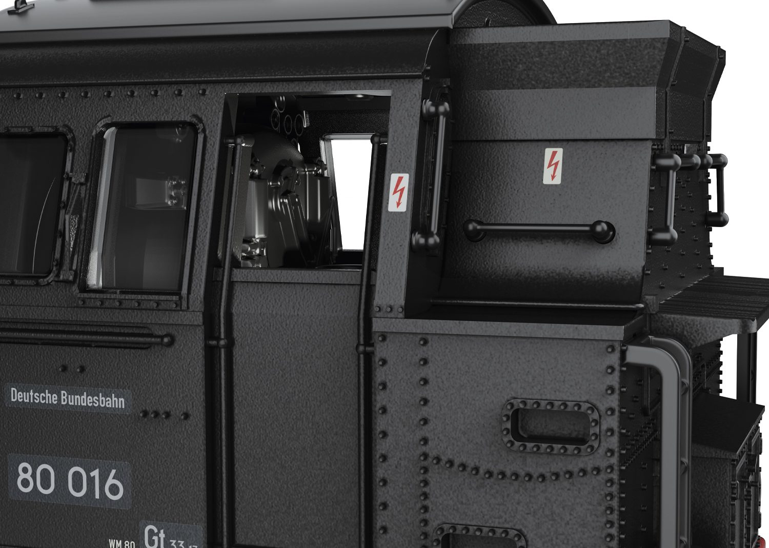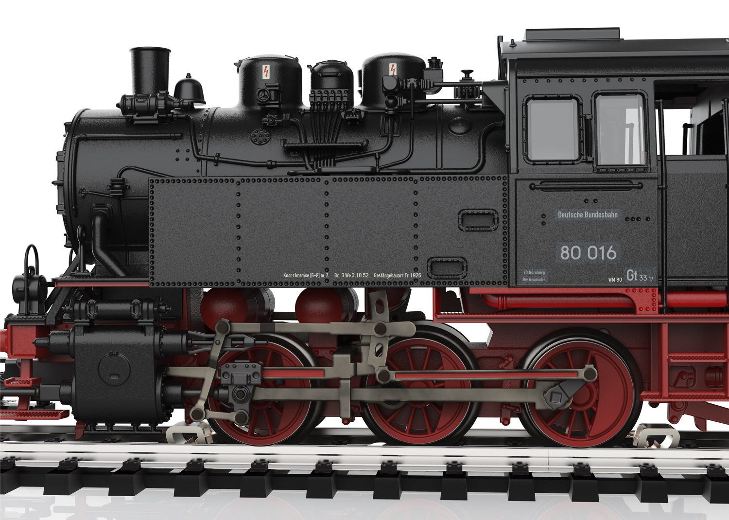 German Federal Railroad class 80 tank locomotive. This is a version with three boiler domes, a bell, and a turbo dynamo on the left, a smokebox door without a central lock with the number sign in the middle. Deep black basic paint scheme. Road number 80 016. The locomotive looks as it did around 1953.
