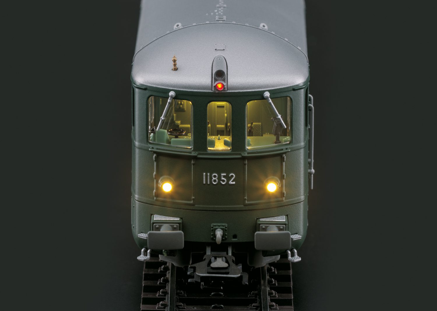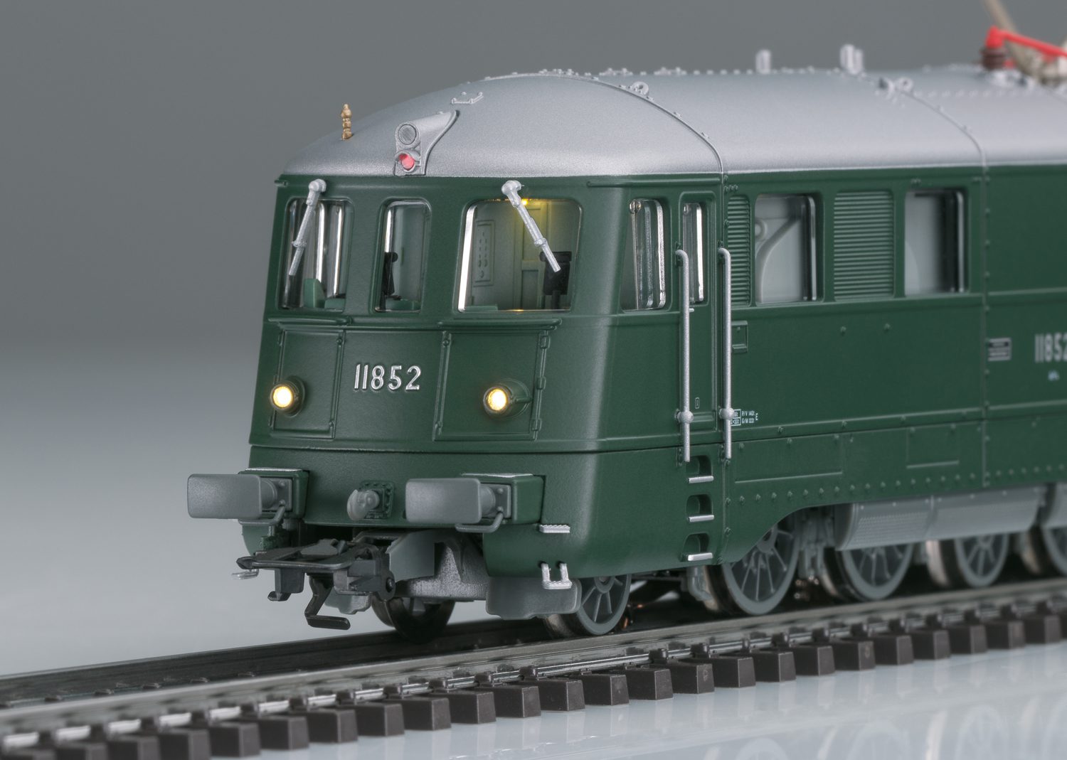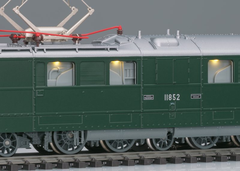Swiss Federal Railways (SBB) class Ae 8/14 “Landilok” heavy double electric locomotive. Dark green basic paint scheme. Version with 2 pantographs. Sleeve buffers with rectangular buffer plates. Locomotive road number 11852. The locomotive looks as it did at the start of the Seventies.