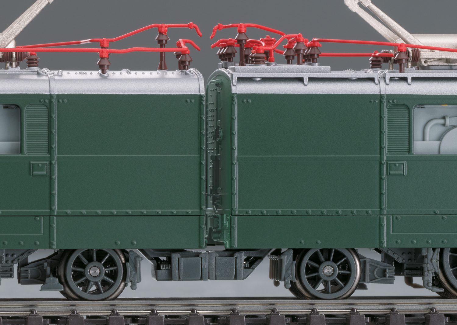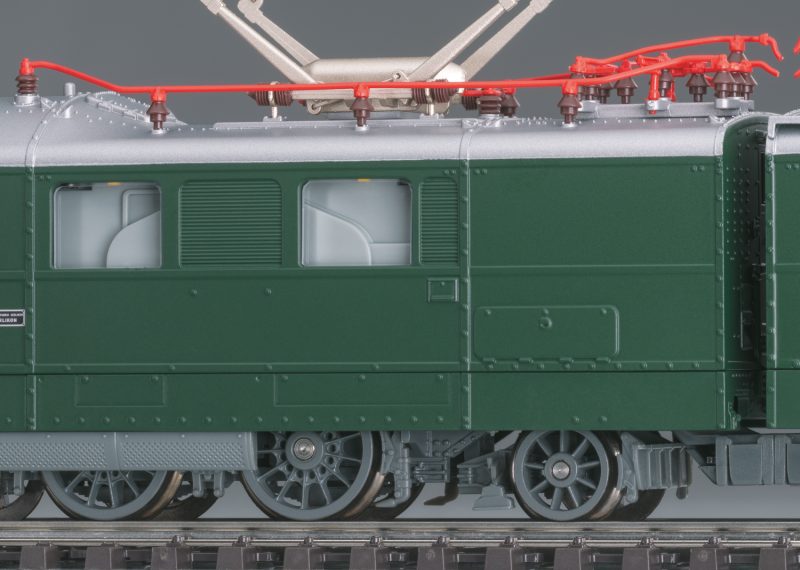 This locomotive has an mfx+ digital decoder and extensive light and sound functions. Each locomotive half has controlled, high-efficiency propulsion with a flywheel. 4 axles in each locomotive half powered. Triple headlights and 1 white marker light change over with the direction of travel, will work in conventional operation, and can be controlled digitally. This lighting can be switched to 1 red marker light when the locomotive is running “light”. There is a double A light function. Maintenance-free, warm white and red LEDs are used for the lighting. The lights for running against traffic, cab lighting, and engine room lighting can be controlled digitally. There are close couplers with guide mechanisms at the ends of the locomotive and an operating close coupler between the locomotive halves. The roof equipment is detailed with roof conductors, insulators, and roof walkways as well as double-arm pantographs. Both pantographs can be raised and lowered digitally. The minimum radius for operation is 360 mm / 14-3/16″. The cutouts in the end skirting next to the standard coupler pocket can be closed with fill-in pieces included with the locomotive. Brake hoses and prototype coupler imitations are included. Length over the buffers 39.1 cm / 15-3/8″.