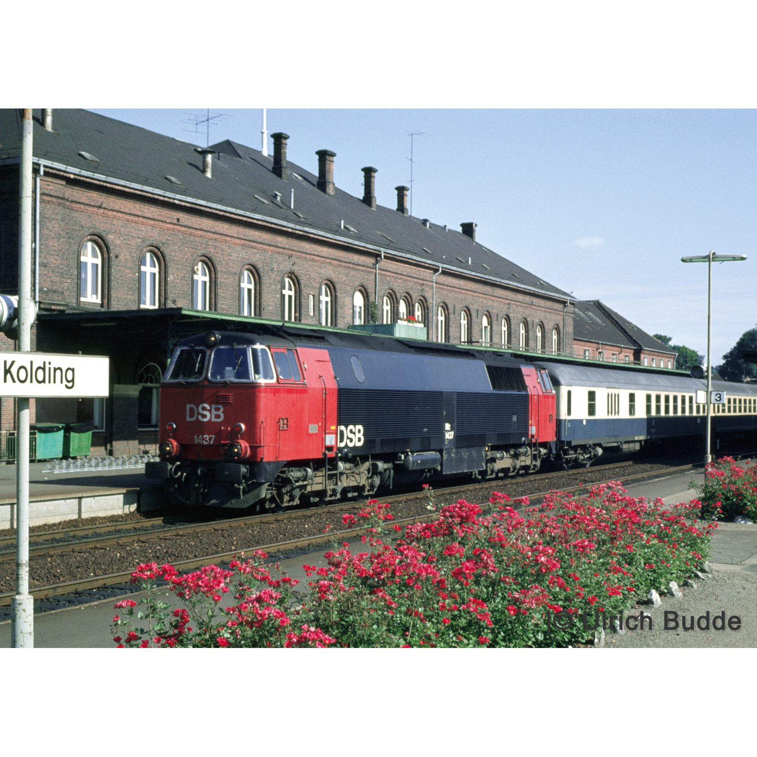 Danish State Railways (DSB) class MZ diesel-electric locomotive. This is a model of a general-purpose machine in a red/black paint scheme. Third production run, built by Nydqvist och Holm AB (NOHAB) in Trollhättan, Sweden. The loco looks as it did in era IV, during the 1970s/1980s.
