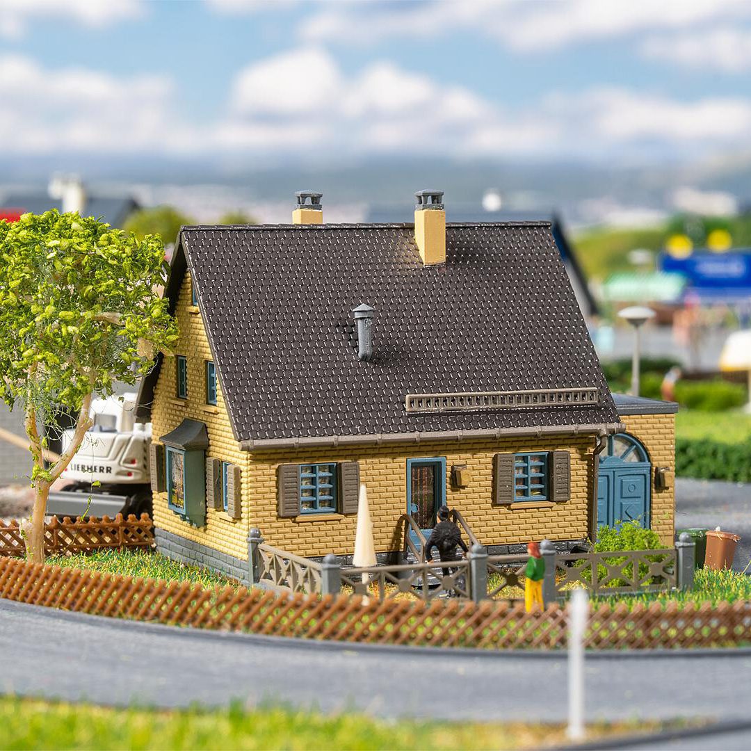 A light-coloured clinker brick house with a fenced front garden and blue shutters. Perfect as a detached house for a model family or to decorate the suburbs.