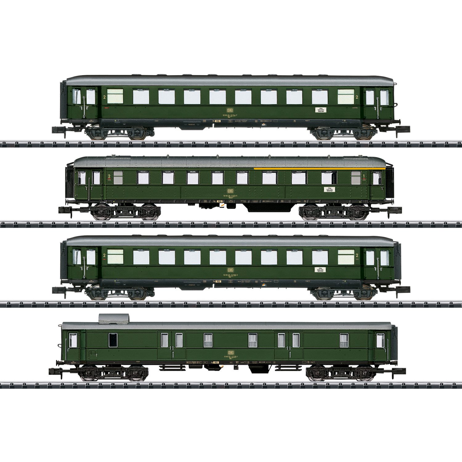 2 type Bye 670 limited stop fast train streamlined passenger cars, 2nd class, 1 type AByse 617 limited stop fast train streamlined passenger car, 1st/2nd class, and 1 type Düe 938 (Pw4ü-36) passenger train baggage car. The cars look as they did around 1969 as train E 4505 on the German Federal Railroad (DB) in a chrome oxide green paint scheme.
