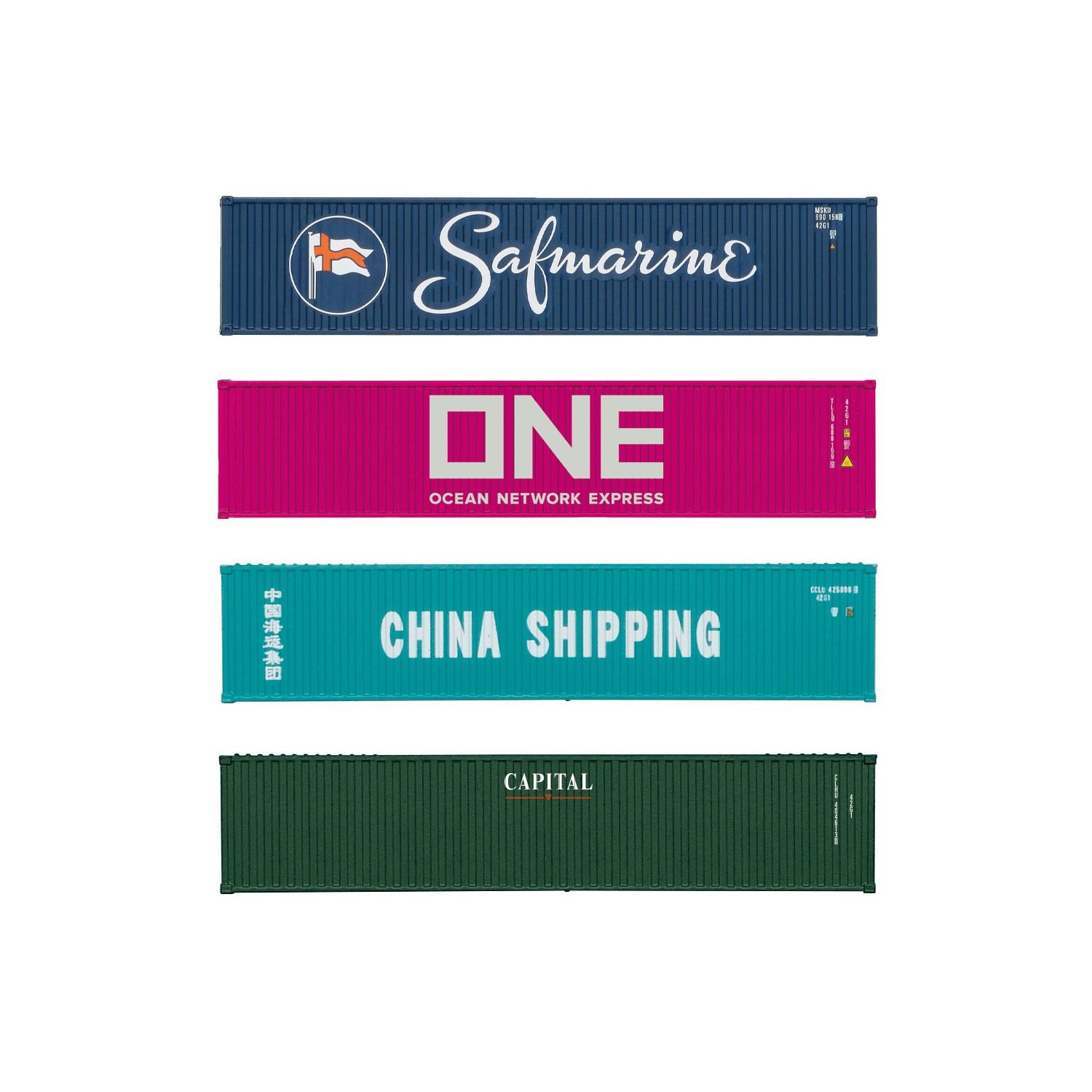 Four 40-ft. standard box containers from different companies. The containers look as they currently do in era VI.