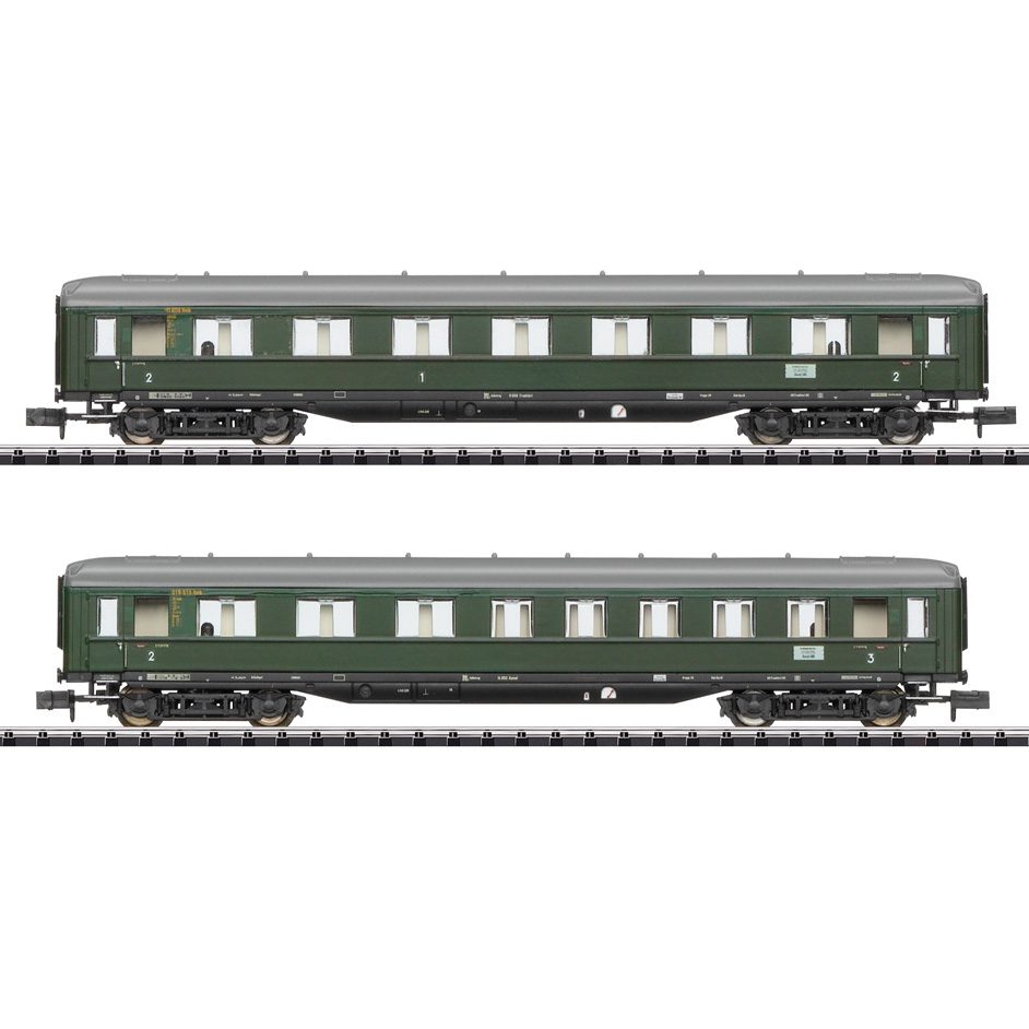 German Federal Railroad (DB) express train passenger car set consisting of a type AB4ü-38 express train passenger car, 1st/2nd class, (train route Hamburg – Cologne) and a type BC4ü-39 express train through car, 2nd/3rd class, (train route Hamburg – Basle) around 1952.