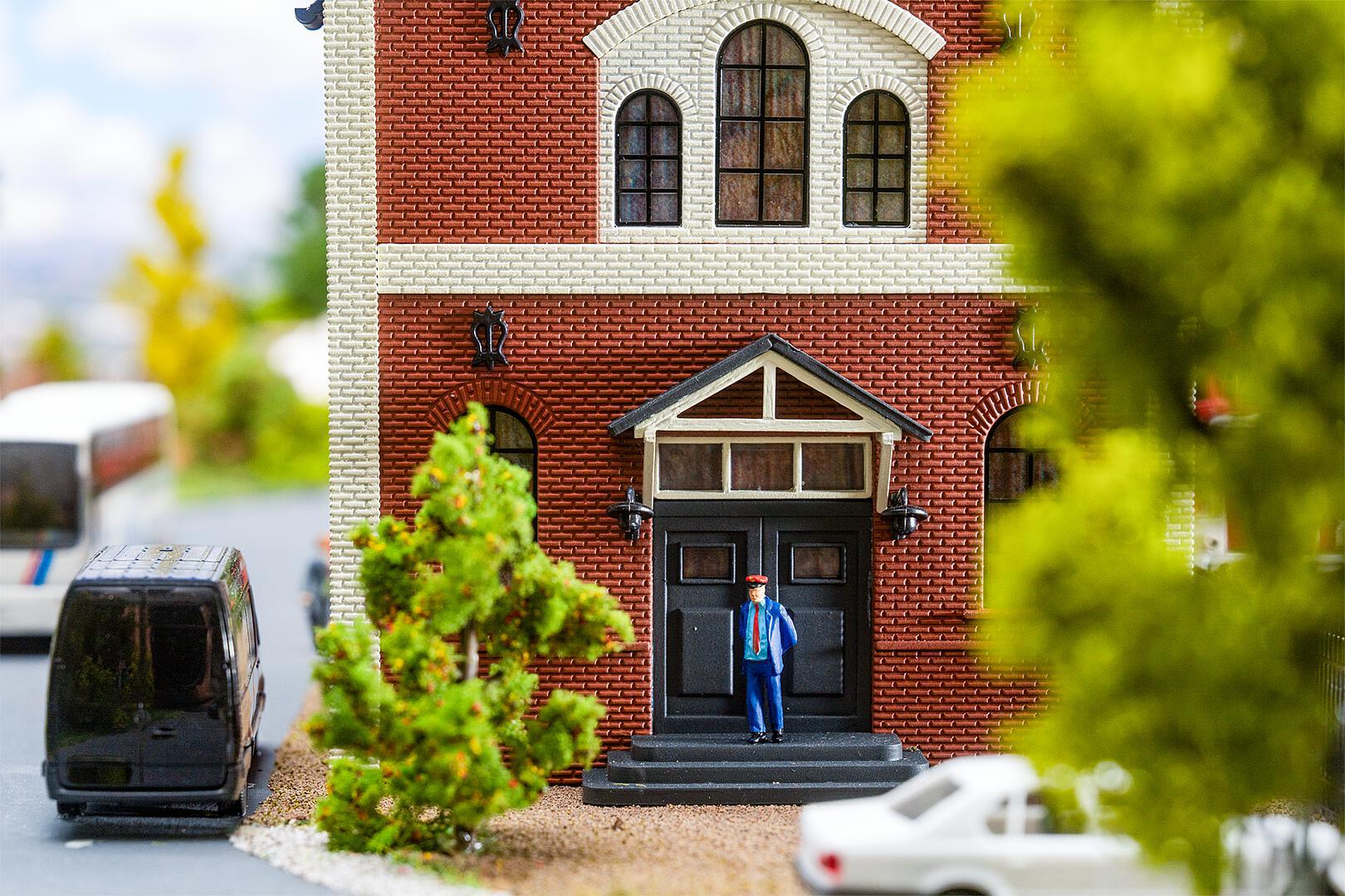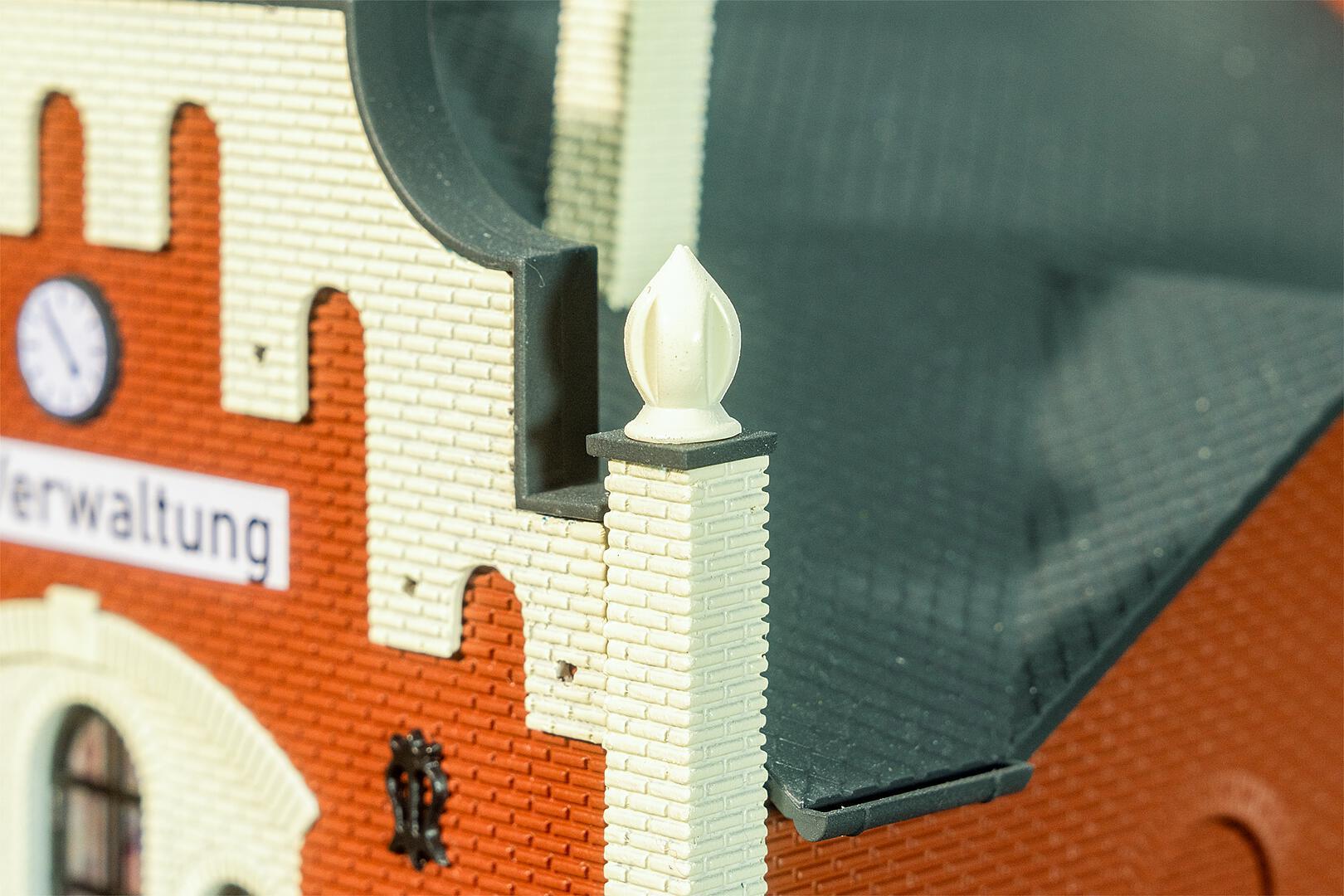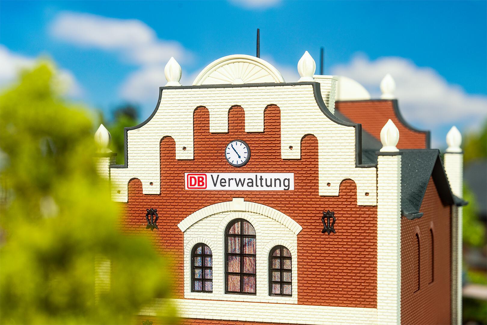 The model in typical factory style with red brick and white windows enriches any model railway layout. As a DB administration building, it looks particularly good in larger station scenarios and adds a touch of authenticity to miniature railway operations.