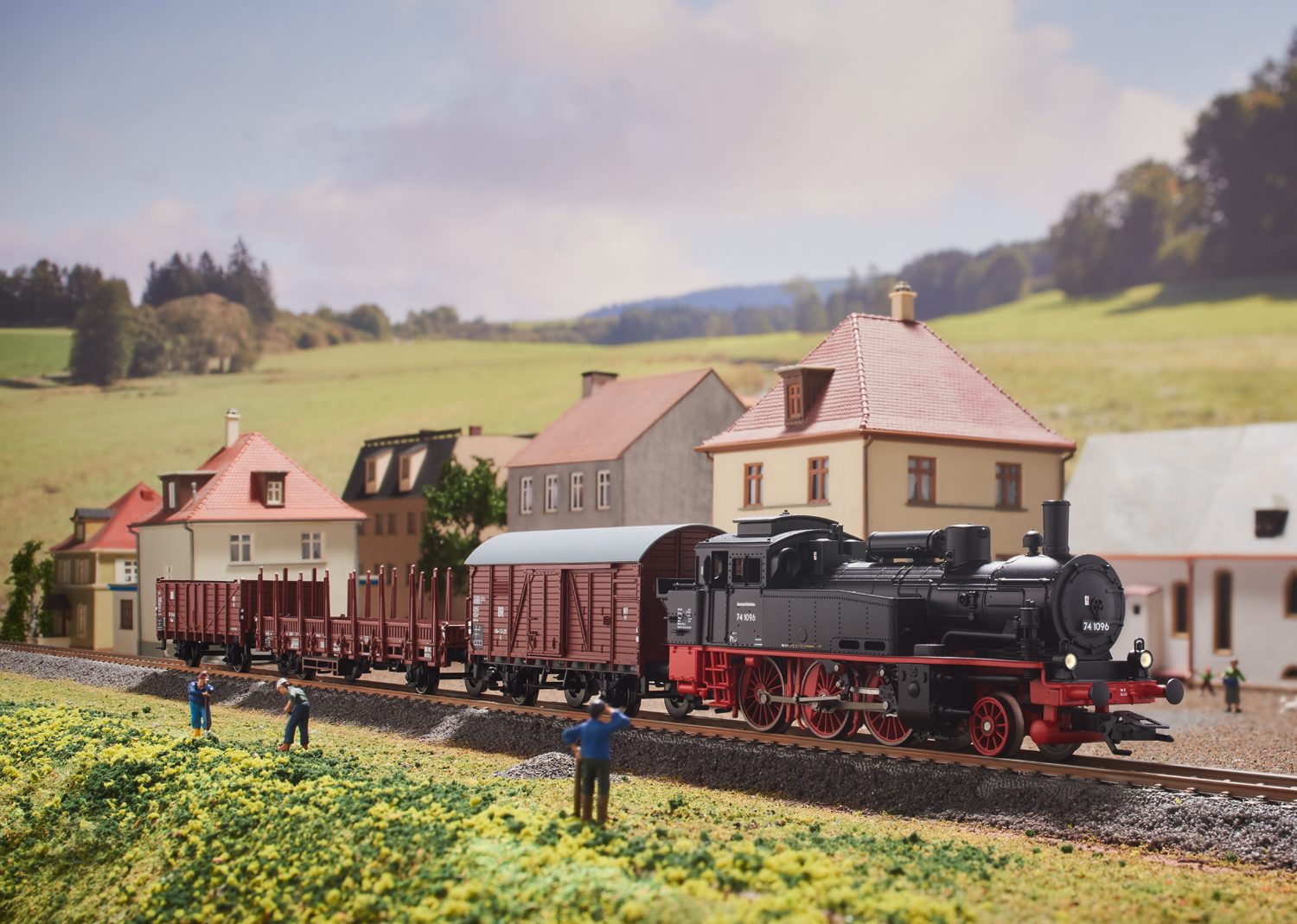 German State Railroad (DR/GDR) class 74 tank locomotive, type Omu Association design gondola, a type Gr Association design boxcar of the German State Railroad (DR/GDR), and a German Federal Railroad (DB) type Rlmms 58 stake car in temporary use in the GDR.