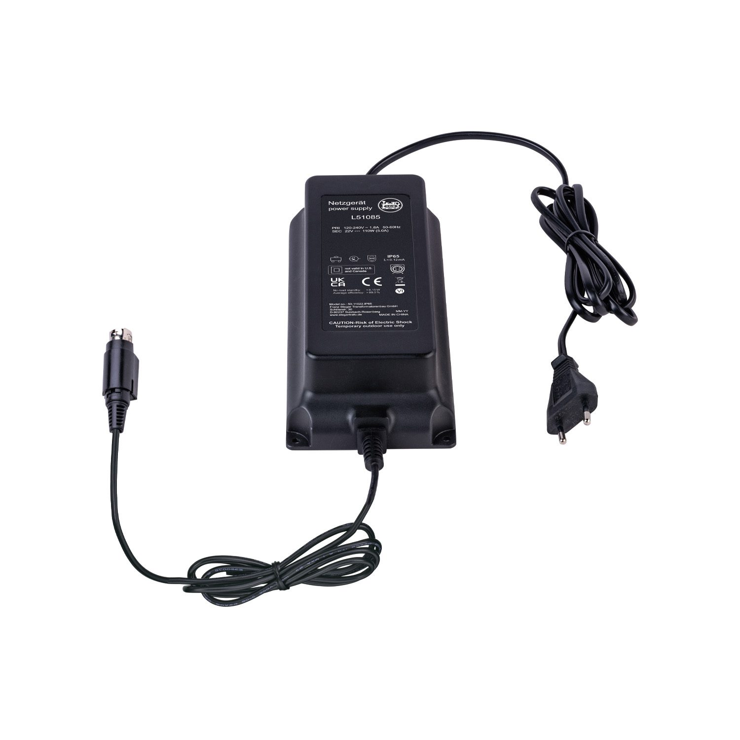 Spray water protected switched mode power pack 110 VA, IP 65 with a Euro plug. 120 volts – 240 volts. Can be used for the locomotive controller 51079 and the CS 2/3 60215, 60216, 60226.