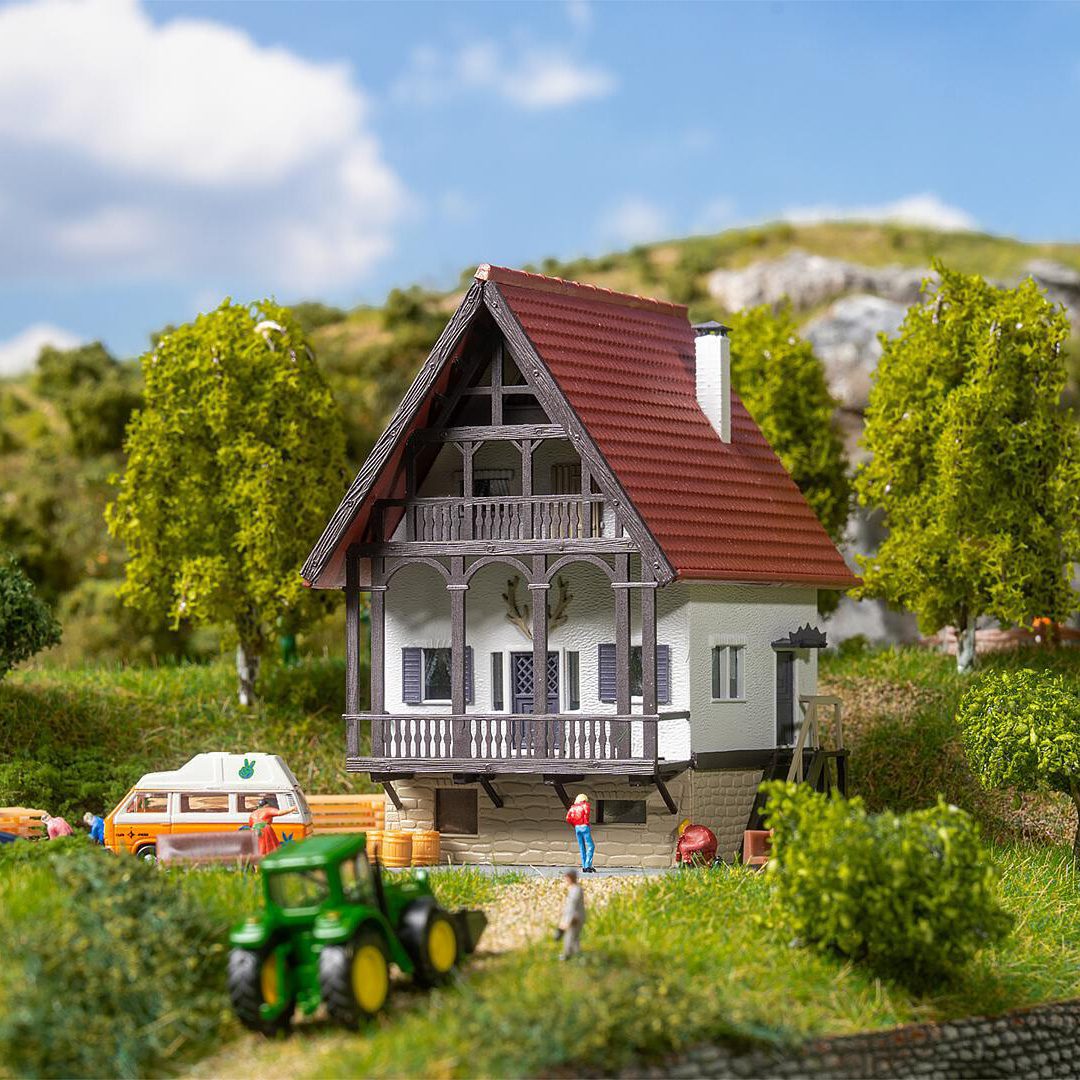 Rural idyll for your model! This charming white forester’s lodge in a traditional architectural style brings rustic flair to your model landscape. Lovingly designed half-timbered elements, a red-roofed pitched roof and the wooden balcony construction in front give the building a warm, inviting appearance – perfect for the edge of a forest, clearing or small village ensemble.