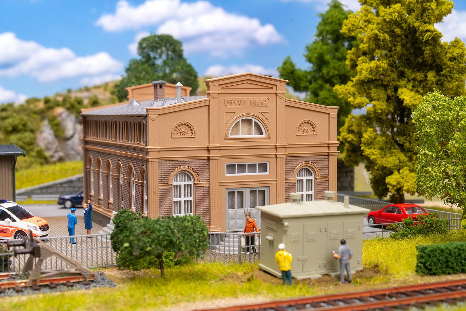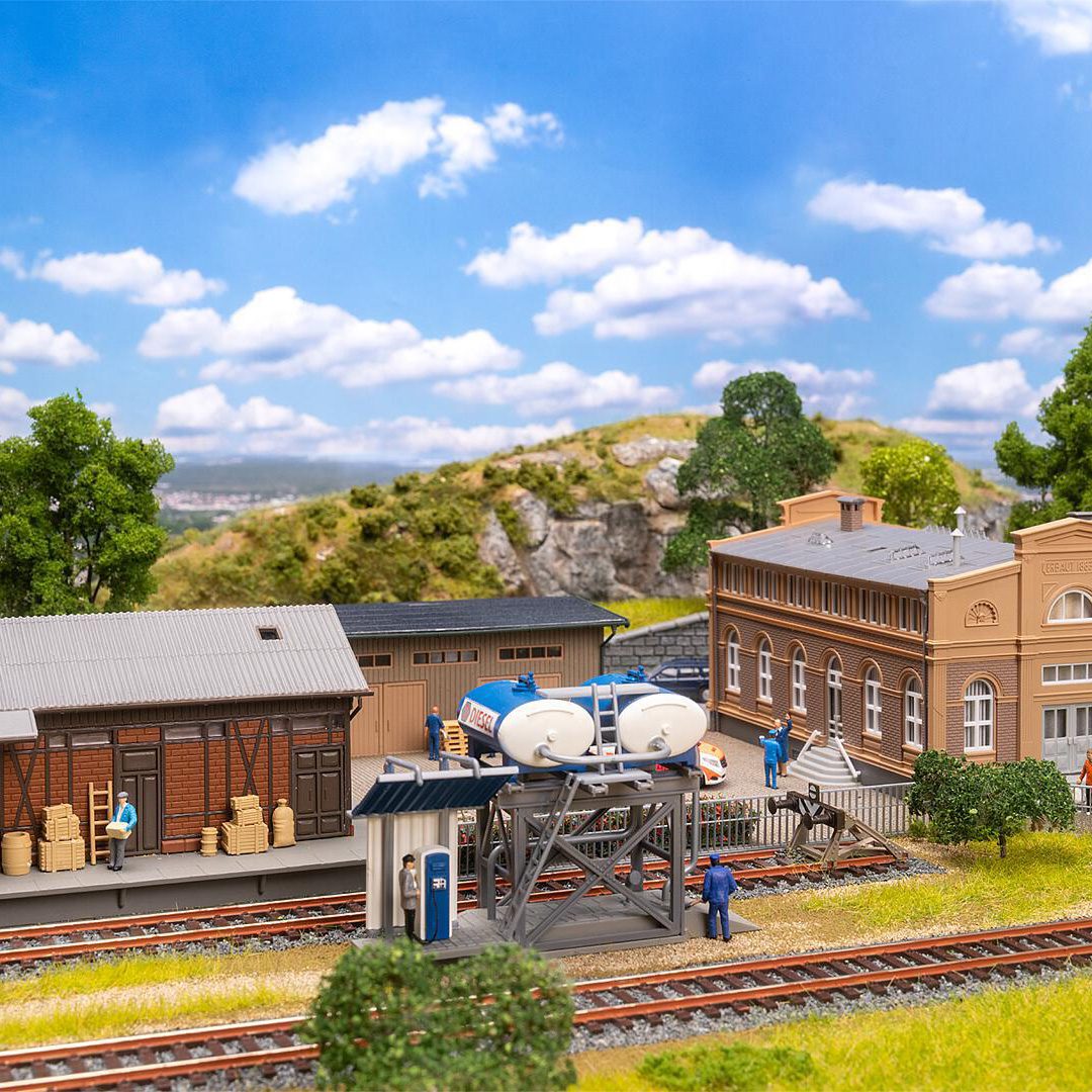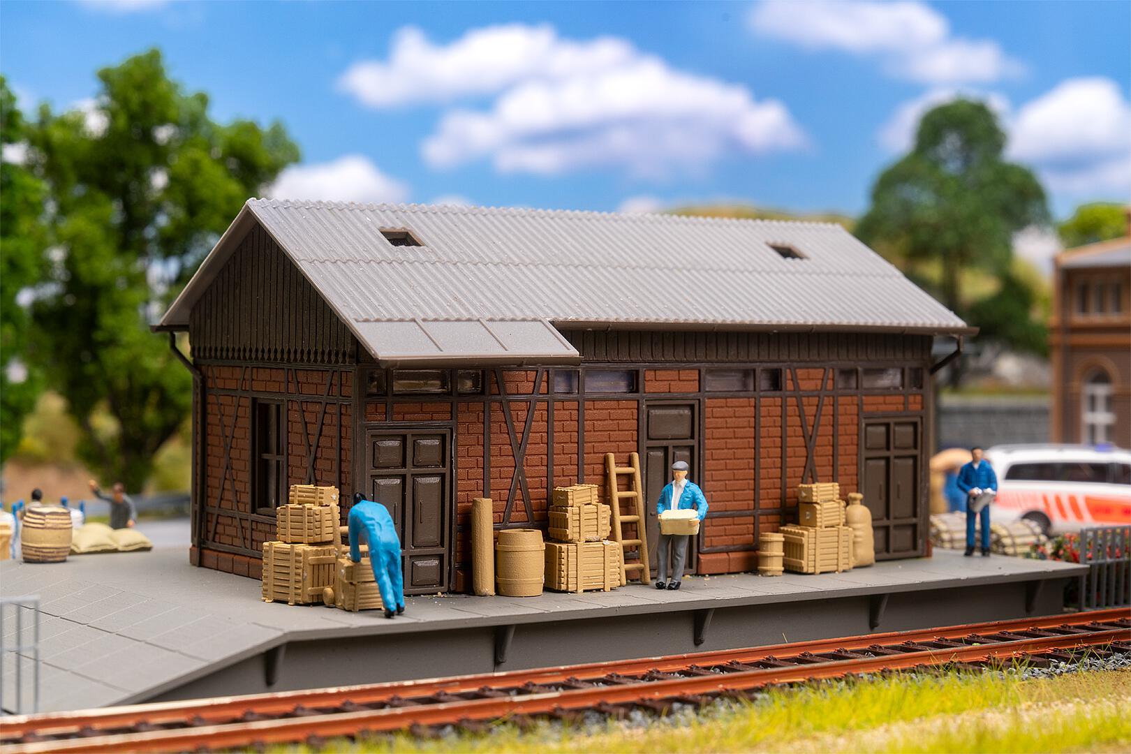 This action set transforms any railway station into an authentic goods handling centre! The sand-coloured, brick-built administration building keeps operations in order, while the goods shed with red brick walls serves as a temporary storage area for the goods. A simple wooden shed, a transformer house and a diesel filling station round off the scene – perfect for atmospheric logistics in miniature. Contents: Goods shed, warehouse, diesel filling station, transformer house, administration building, decoration (barrels, cloth sack, pallets, wooden crate).