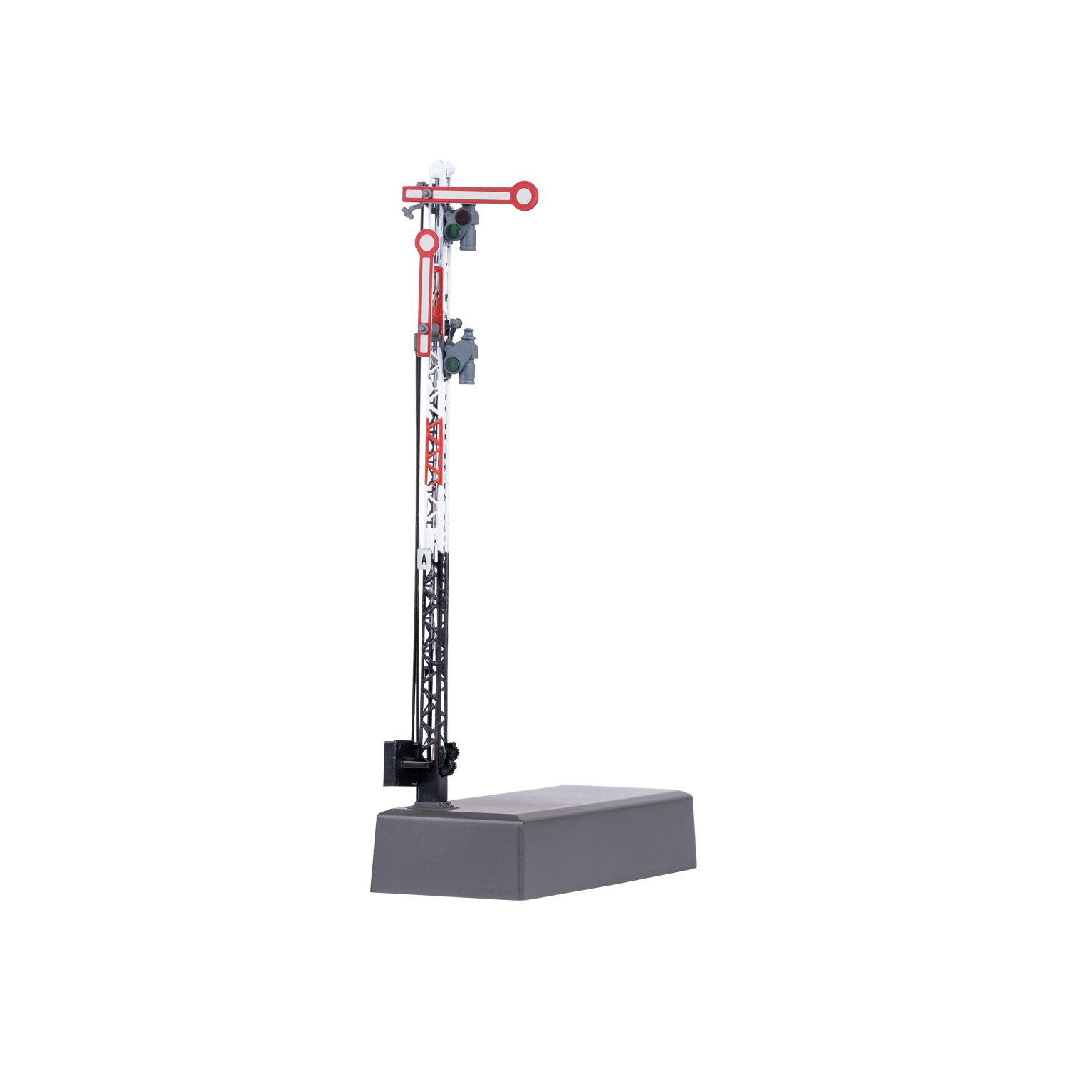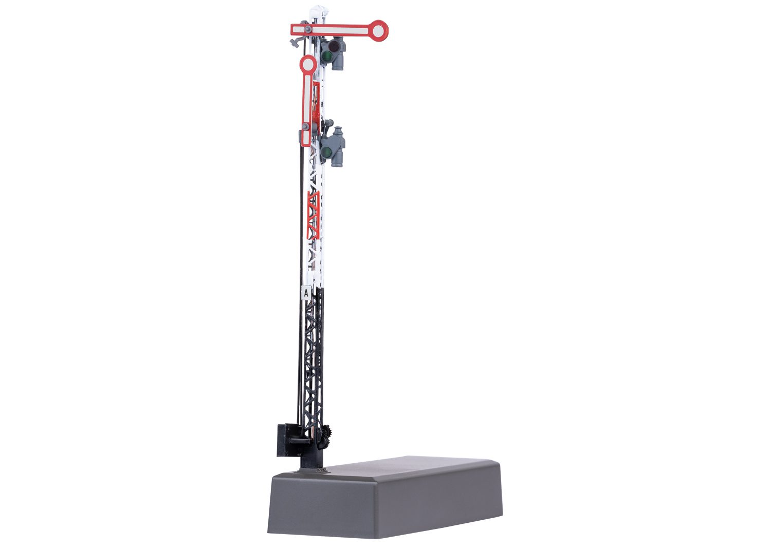 Two uncoupled semaphore blades and a partially open lattice mast without a mast sign are included. The lattice mast is done in black, white, and red. The prototypical height of the lower area is in black when using below-baseboard mechanism mounting. The signal changes from red (Hp 0) to green (Hp 1) or red (Hp 0) to green/yellow (Hp 2).