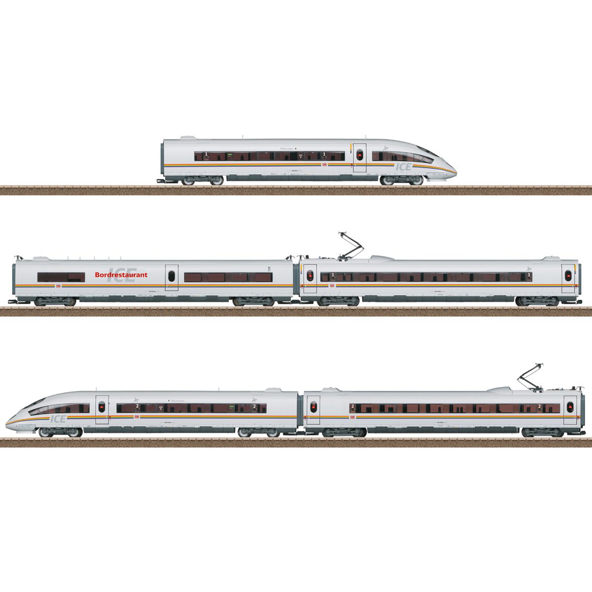 ICE 3 high speed powered rail car train. German Railroad, Inc. (DB AG) class 403. 1 type 403.0 end car, 1st class, 1 type 403.1 transformer car, 1st class. 1 type 403.3 “Bordrestaurant” dining car, 1 type 403.6 transformer car, 2nd class, 1 type 403.5 end car, 2nd class. Tz 304 powered rail car train named “München” with rainbow colored stripes as a “Railbow”. The train looks as it did starting in July of 2021.