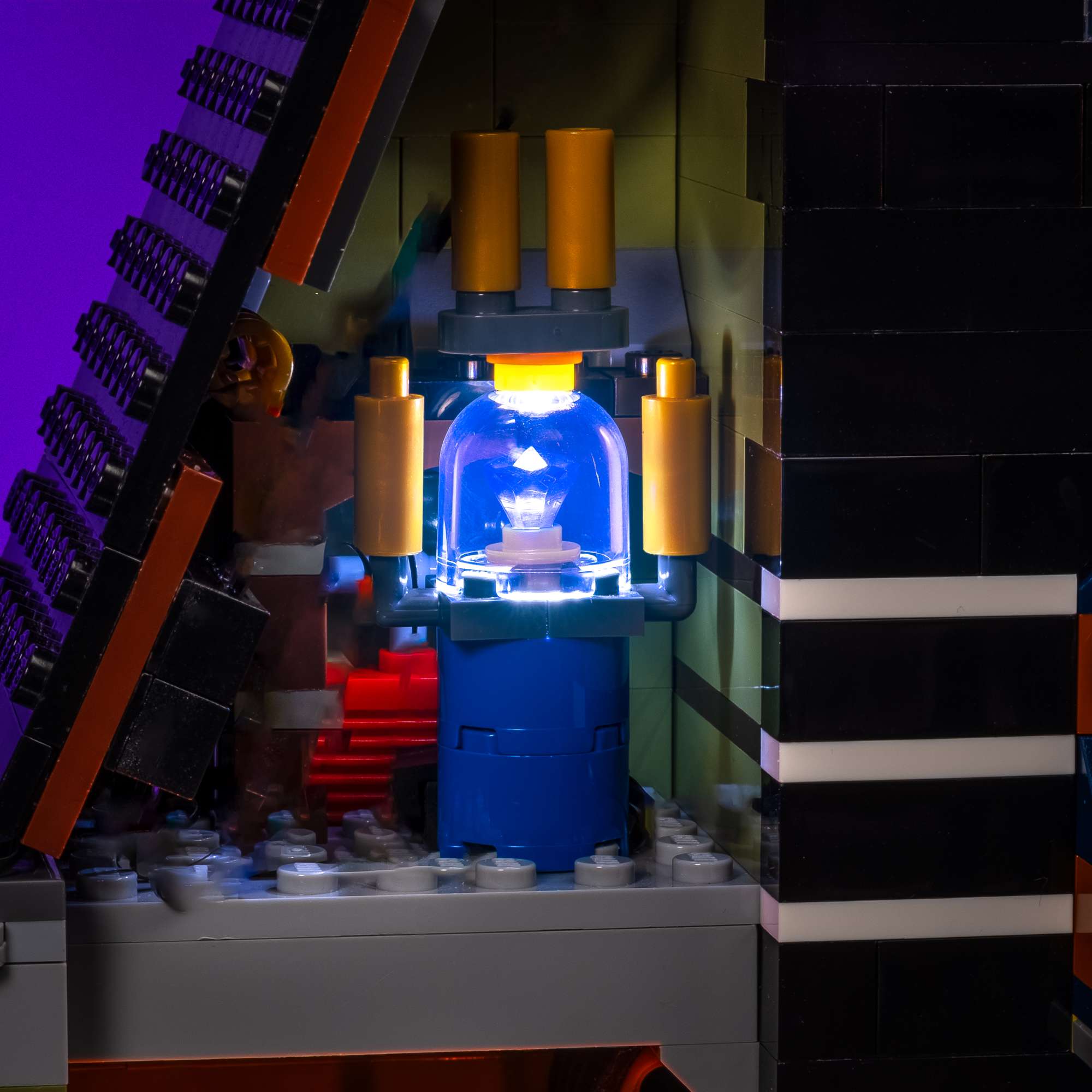 Bring eerie atmosphere and cinematic horror to your display with an upgraded Light My Bricks™ Light Kit for the LEGO® Icons Haunted House 10273. Exterior lamps glow an unsettling green, balanced by a warm white glow through the stained-glass window, while shifting orange and green lights flicker across the tower and lower windows for an otherworldly effect. Inside, flickering candles, pulsing sphinx eyes, and lightning flashes behind the portrait and tower create a chilling sense of movement and dread. From the dimly lit elevator to the glowing Orb of OGEL, every detail of this kit adds spine-tingling realism, making the Haunted House a true centerpiece of spooky display.
