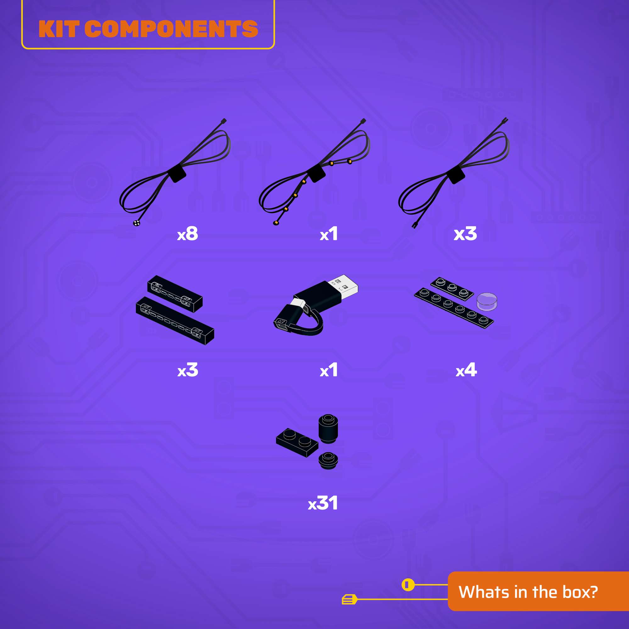 - All component casing and housing has been designed to connect seamlessly onto the LEGO® stud system, with LEGO® dimensional parts.
