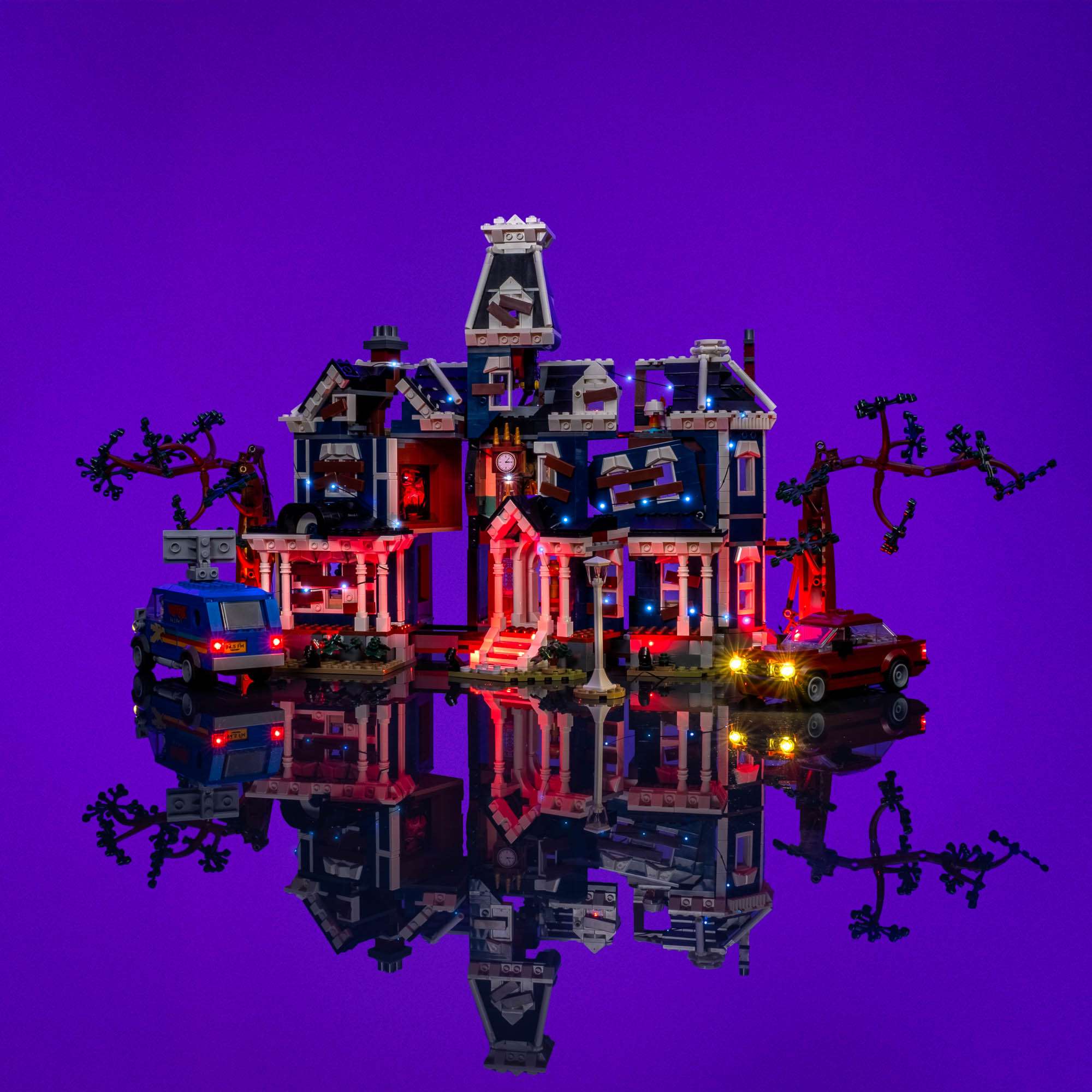 Step into the darkness of Hawkins with a Light My Bricks™ Light Kit for the LEGO® The Creel House 11370, designed to mirror the shifting reality of Stranger Things. This advanced lighting system delivers two distinct worlds in one build: a warm, lived in Hawkins and the terrifying glow of Vecna’s Upside Down, with lighting that automatically changes as the house opens and closes using dual Flux Touch Plates. Inside the house, warm white lamps and ceiling lights create an uneasy realism, complete with subtle scary and pulsing effects, while a custom illuminated streetlamp completes the real world scene. As the house transforms, red spotlights and shimmering blue spore lights flood the exterior, recreating Vecna’s interdimensional mind lair with dramatic intensity. Both vehicles are fully lit with headlights and taillights and can be powered independently or connected to the house, making this light kit a bold, cinematic centrepiece that blends innovation, atmosphere and playability.