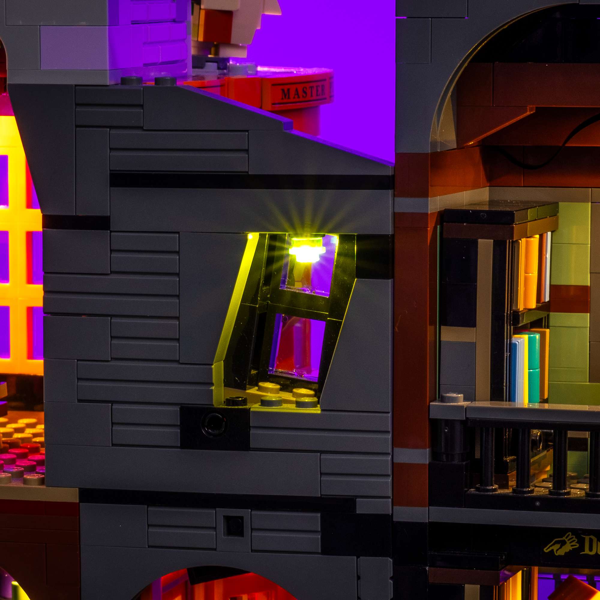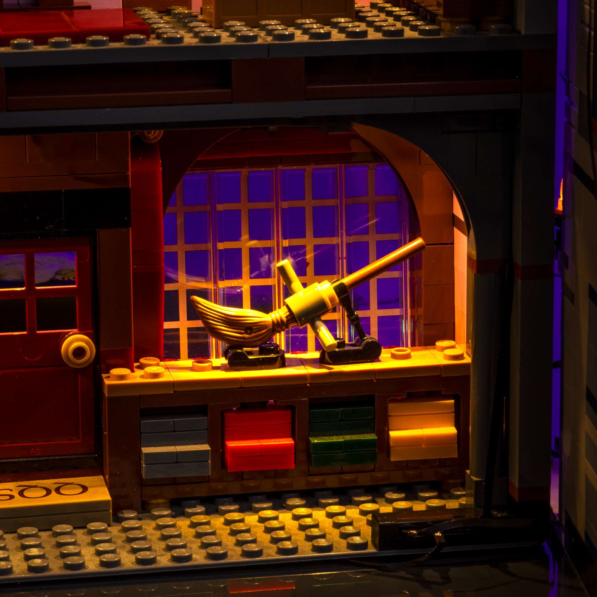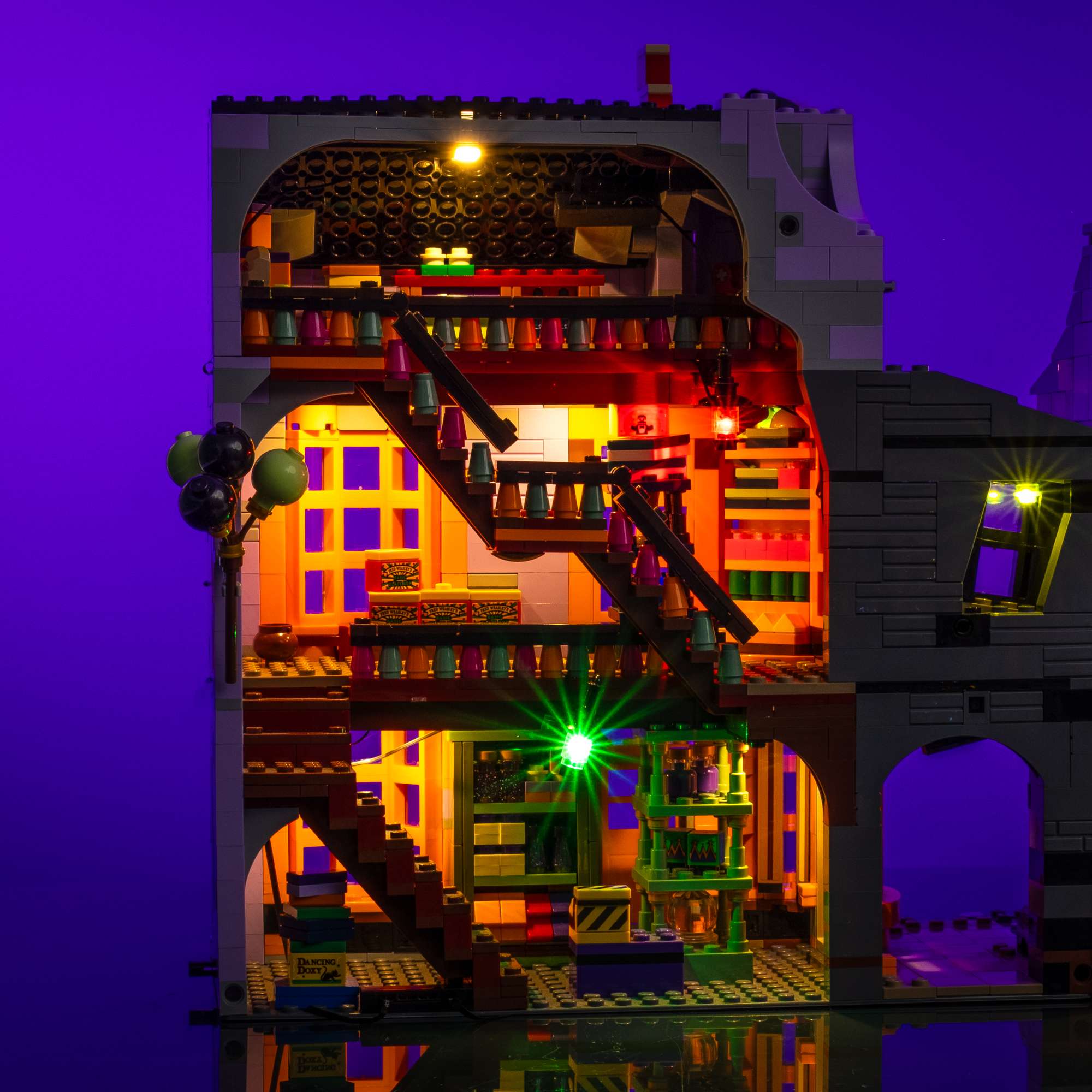 Step into the magical hustle of Diagon Alley™ with a custom Light My Bricks™ light kit for the LEGO® Diagon Alley™ 75978 set, designed to reflect the vibrant charm and cinematic authenticity of the wizarding world. Every shop—from Ollivanders to Weasleys’ Wizards Wheezes—is thoughtfully lit. This kit highlights iconic features like the flickering candles of Scribbulus, the golden glow on the Nimbus 2000, and the colour changing pops and bangs inside the joke shop. The cobbled street is brought to life with lanterns casting a timeless glow, while subtle lighting details like the spooky Knockturn Alley window add depth and intrigue. Whether you’re recreating your favorite scenes or showcasing your build, this lighting kit transforms Diagon Alley into a living, magical masterpiece.