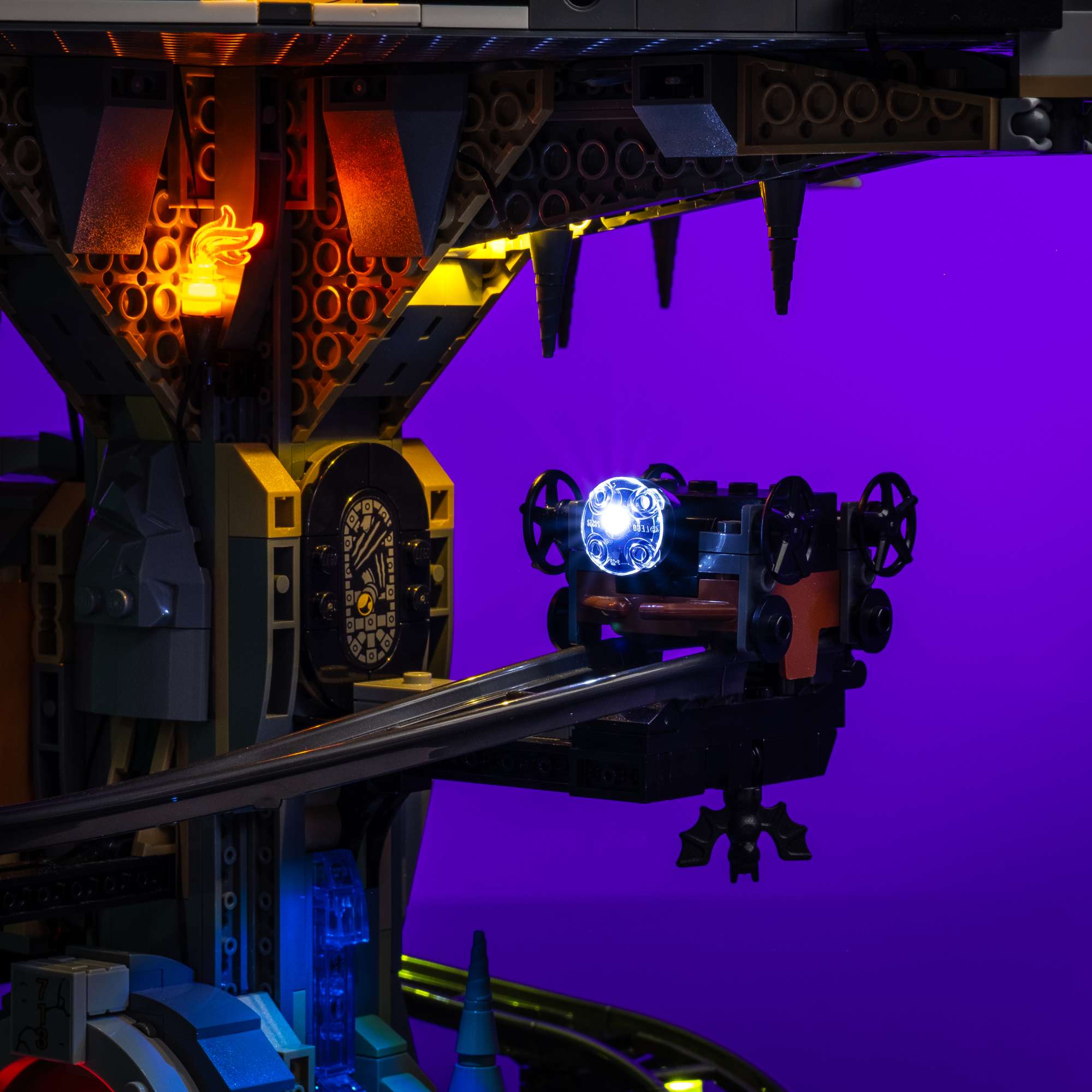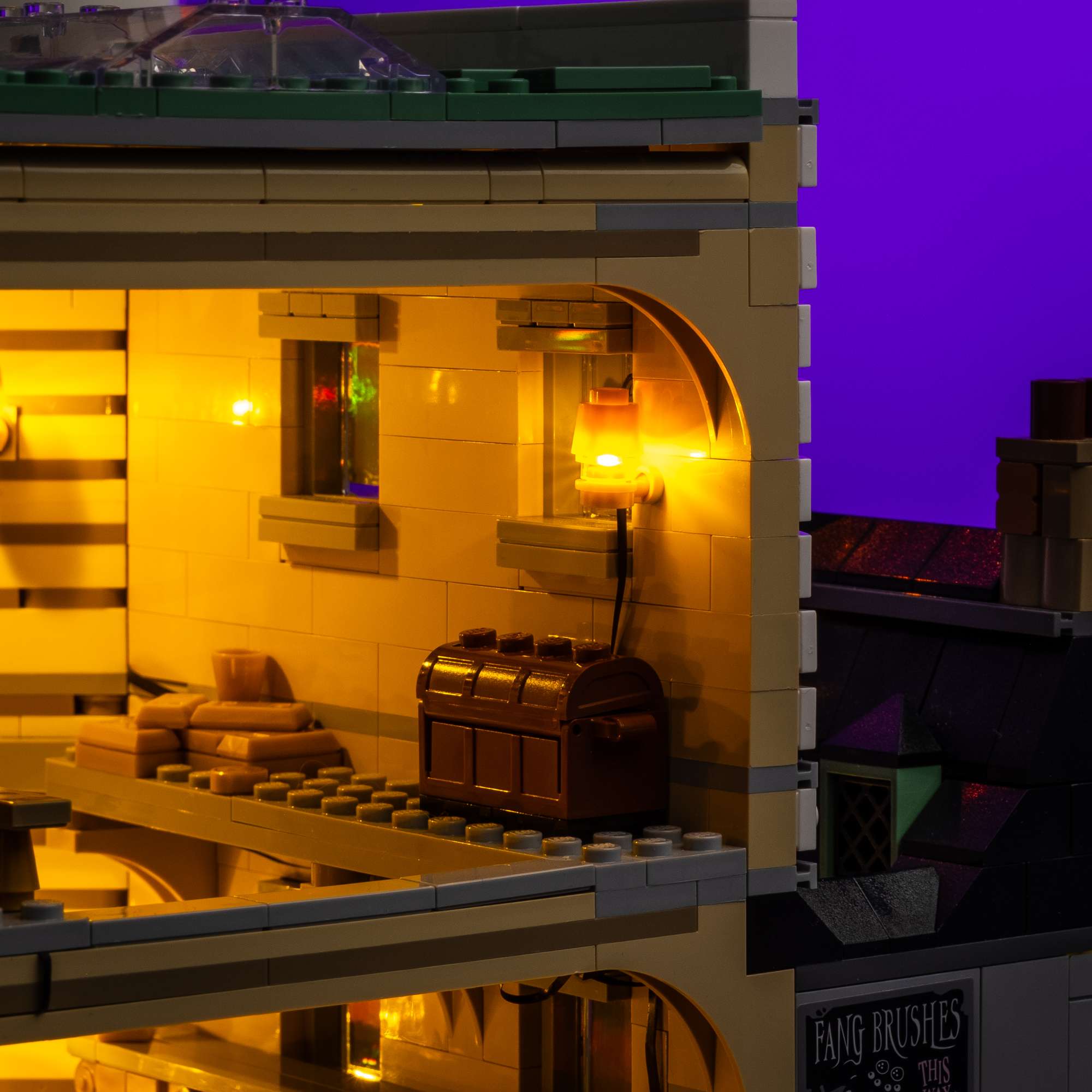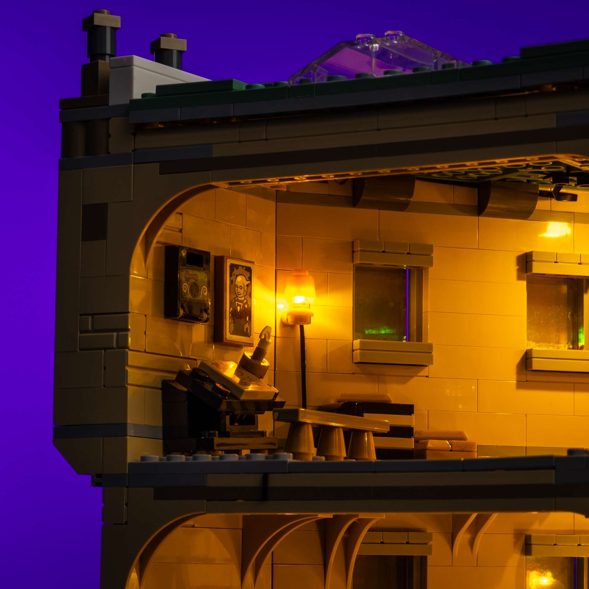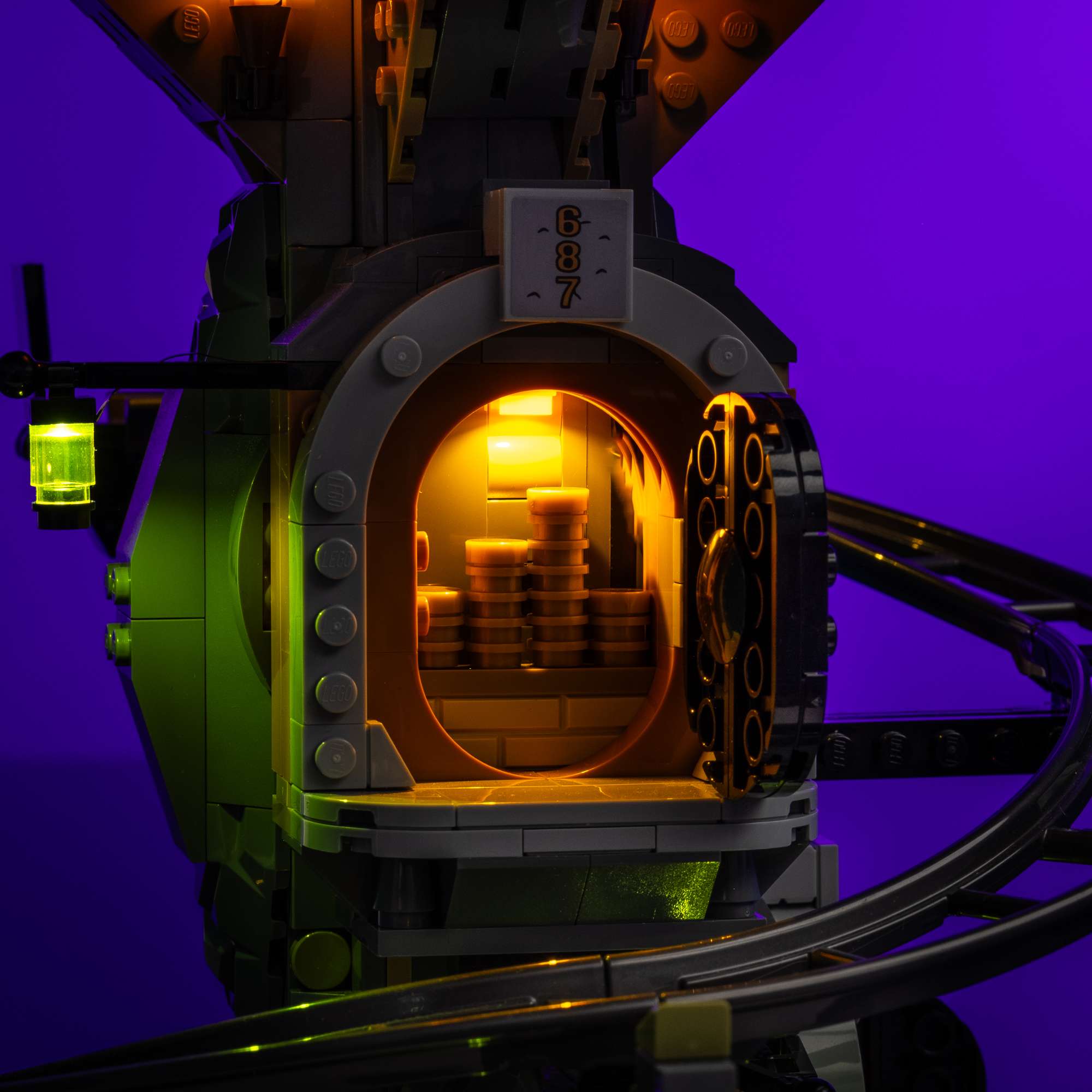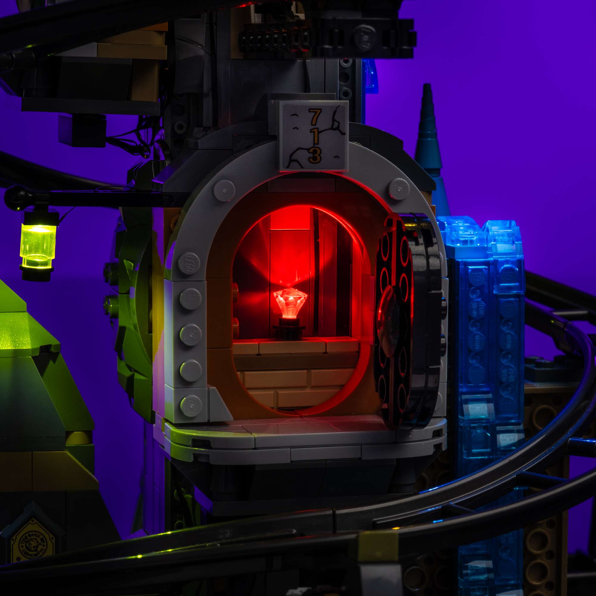 Bring the magic and mystery of Gringotts™ Wizarding Bank to life with a Light My Bricks™ custom Light Kit designed for the LEGO® Collectors’ Edition #76417 set. From the warm glow of the yellow-lit exterior lamps to the intricately lit bank interior—complete with a glowing chandelier and fire-breathing dragon—every detail captures the cinematic atmosphere of Diagon Alley’s most infamous institution. Descend into the labyrinthine vaults to discover flickering torchlight, green-hued lanterns along the tracks, and a glowing red Philosopher’s Stone nestled deep within a secured vault. Whether you’re showcasing your set or reliving your favorite Harry Potter scenes, this light kit casts Gringotts™ in a spellbinding new light.