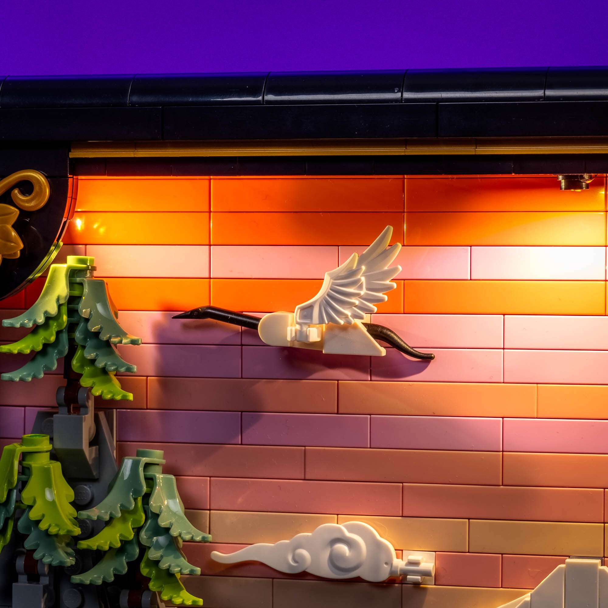Celebrate the tranquil beauty of spring in Japan with the Light My Bricks™ light kit for the LEGO® Japanese Cherry Blossom Landscape 31218. Hidden Astro Large Warm White lights tuck neatly into the top corners of the shadowbox frame, washing the Sakura-themed sky in a gentle glow and drawing your eye into the scene. Above the summit of Fuji-san, a suspended warm white light bathes the mountain, Sango-kaku trees and Japanese Umbrella Pines in a calm, poetic radiance, while soft micro warm white lights trace the arched bridge below, echoing lantern-lit walks to traditional temples and historic landmarks. Around the lake, cool white accents beneath the bridge and behind the waterfall deepen reflections and ripples, enhancing the sense of living water. Finally, the Chashitsu tea house and the blooming cherry blossom tree glow warmly from within the frame, transforming this LEGO® art piece into a serene illuminated landscape you’ll want to admire day and night.