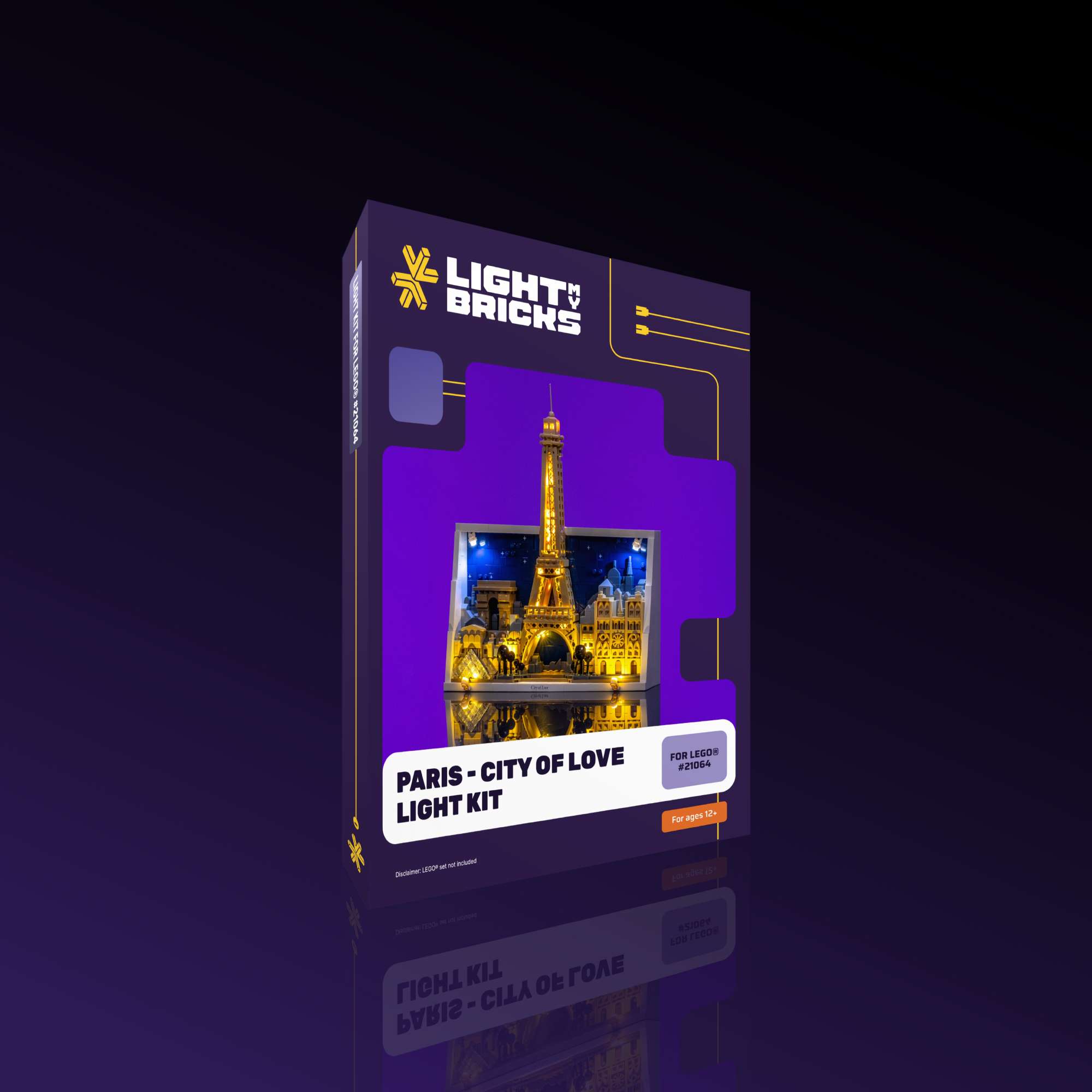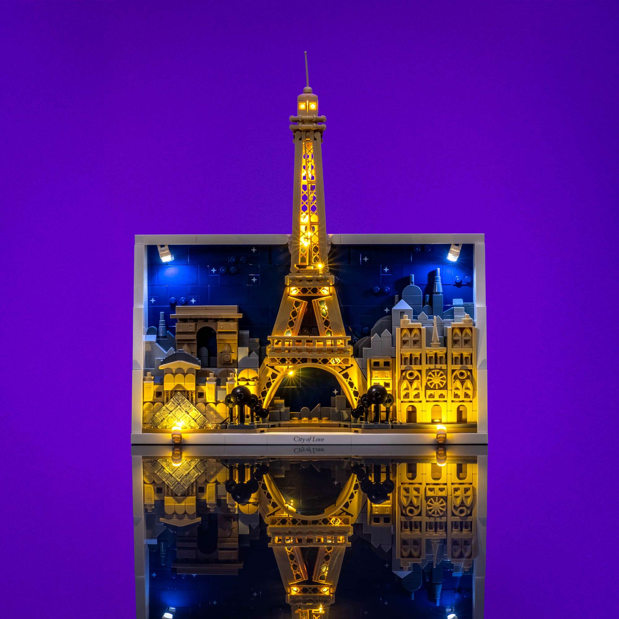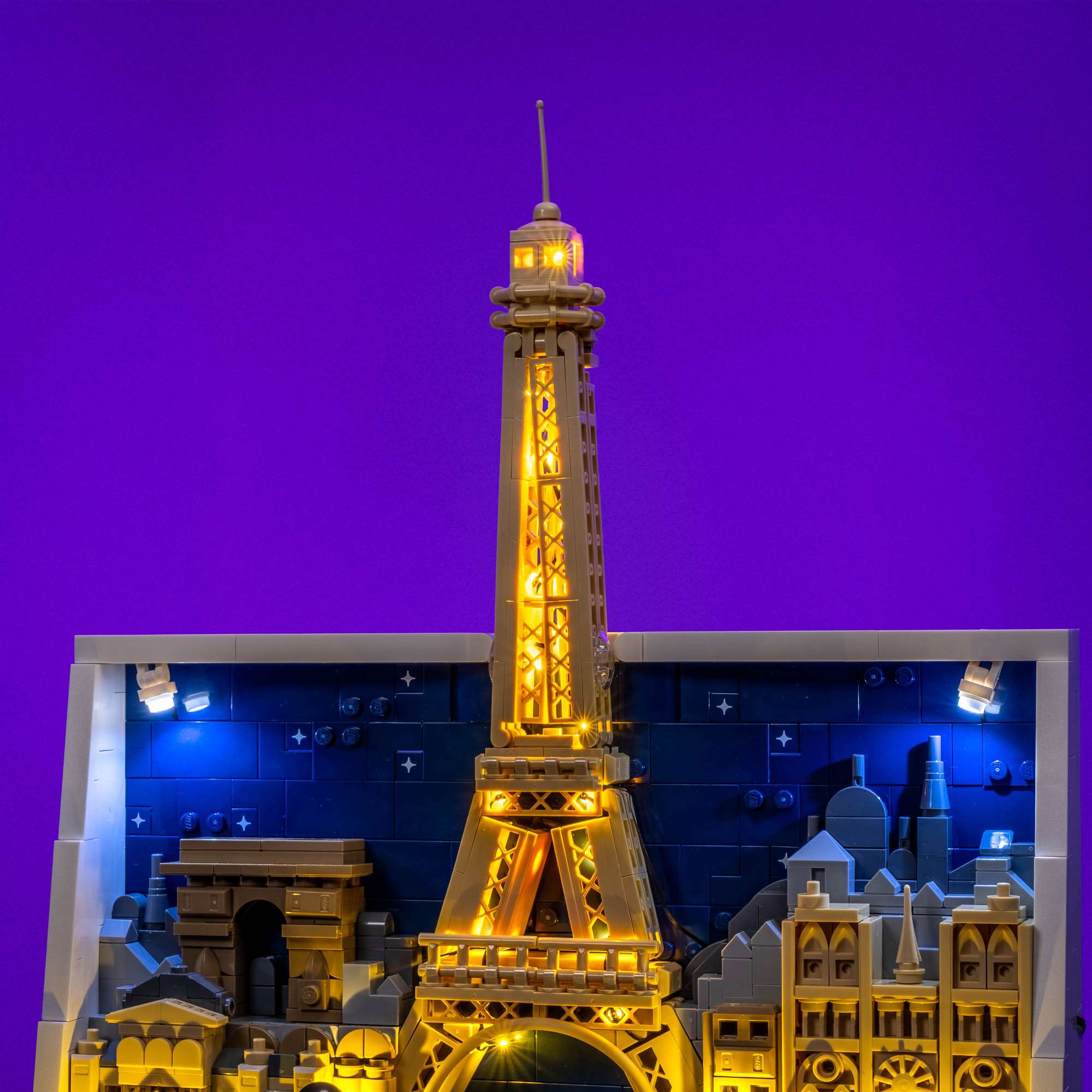 Capture the romance of the City of Light with a Light My Bricks™ Light Kit for the LEGO® Paris – City of Love 21064, designed to enhance the elegance and atmosphere of this iconic skyline display. Soft warm white Micro String lights weave through the Eiffel Tower, creating a gentle glow that brings the landmark to life against the night sky. At the base, discreetly placed warm white lights illuminate the lamp posts and surrounding streets, while brick built spotlights cast an inviting glow across the Parisian buildings. Completing the scene, cool white spotlights from the top of the frame shine downward, adding depth and contrast to the skyline and transforming the artwork into a striking, gallery worthy display.