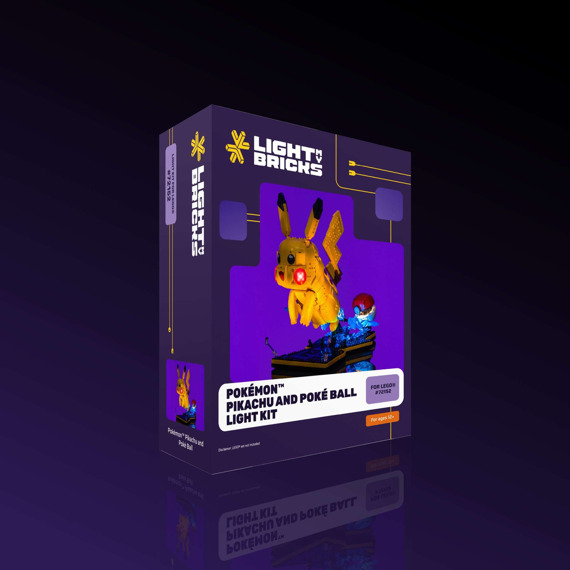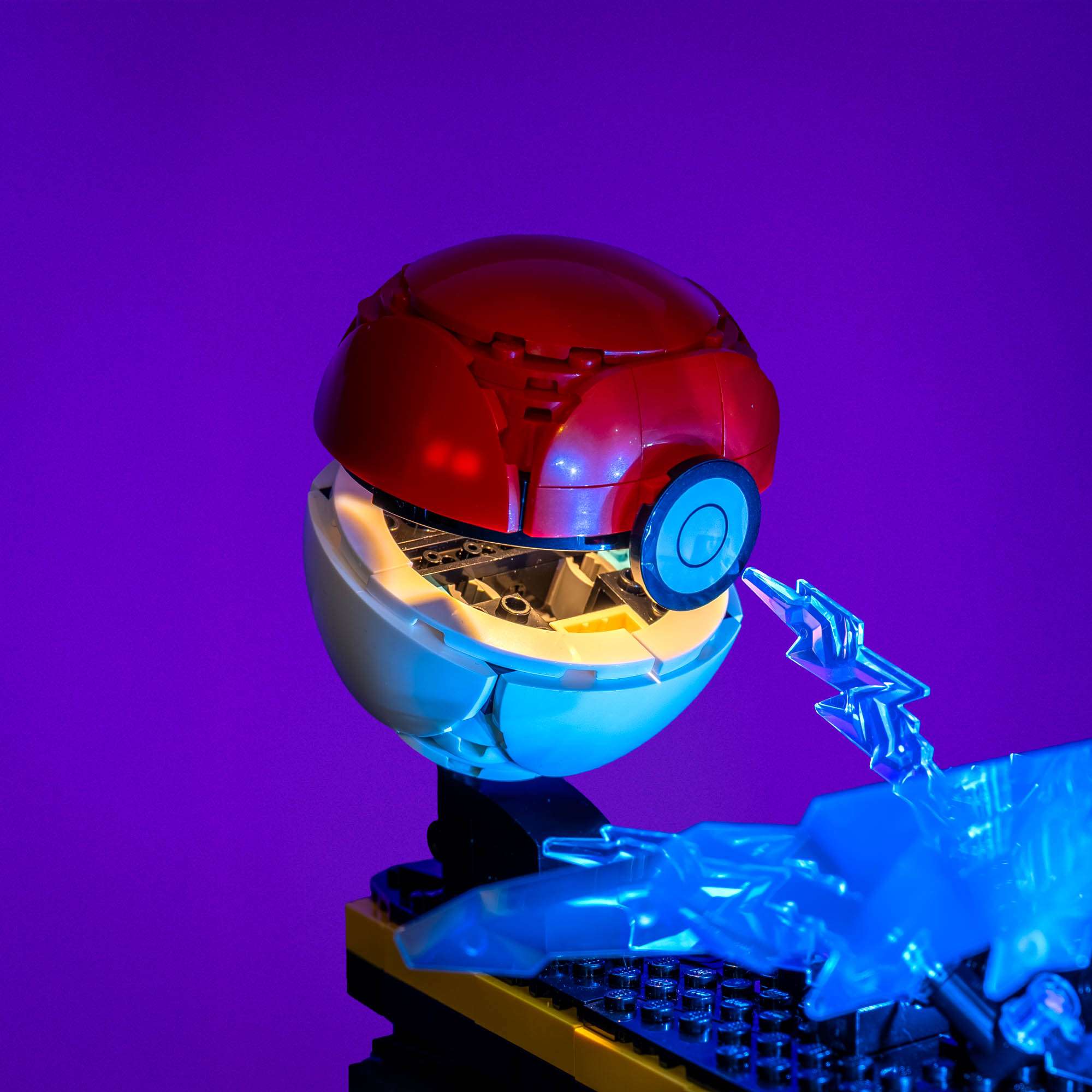 Bring the electrifying world of Pokémon™ to life with this Light My Bricks™ light kit for the LEGO® Pokémon™ Pikachu and Poké Ball 72152. Focused spotlights reach out over the base to bathe Pikachu in a bright, cinematic glow, capturing his determined stance and making every angle of the model feel like a hero shot. Rich red accents in Pikachu’s cheeks glow with character, while clever cable routing keeps him easily removable so you can lift him from the base and still enjoy a fully lit display. Around him, cool blue beams and subtle flicker effects wash over the jagged lightning elements, turning the transparent pieces into a crackling storm of energy. Finally, a warm white glow inside the opened Poké Ball recalls the soft light seen in the show, adding a nostalgic focal point that ties the whole scene together and makes this build stand out on any shelf.