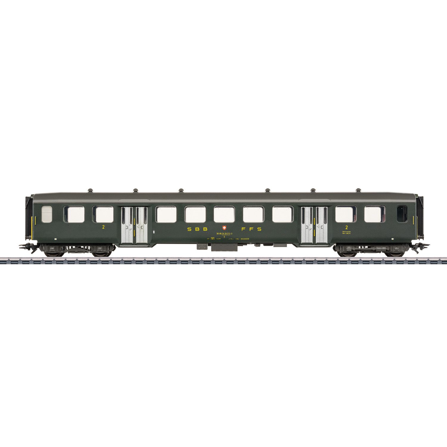Swiss Federal Railways (SBB/CFF/FFS) lightweight steel car, 2nd class, with two three-leaf doors and two entry doors per side. Fir-green paint scheme. The car looks as it did around 1990.