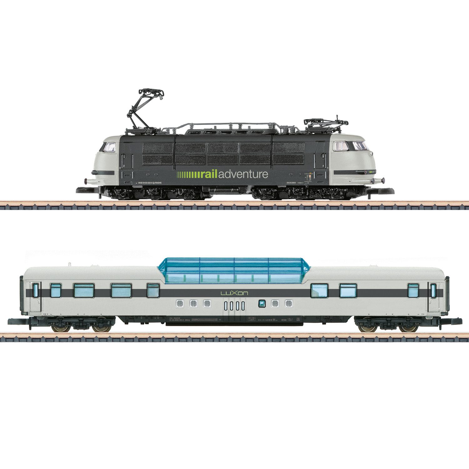 Electric locomotive, road number 103 222-6, painted and lettered for RailAdventure GmbH, Munich, and looking as it does in era VI. Agate gray/traffic gray basic paint scheme. C-C wheel arrangement. Car prototype: Railadventure type SRmz (former AD4üm-62) “LUXON” express train vista dome car.