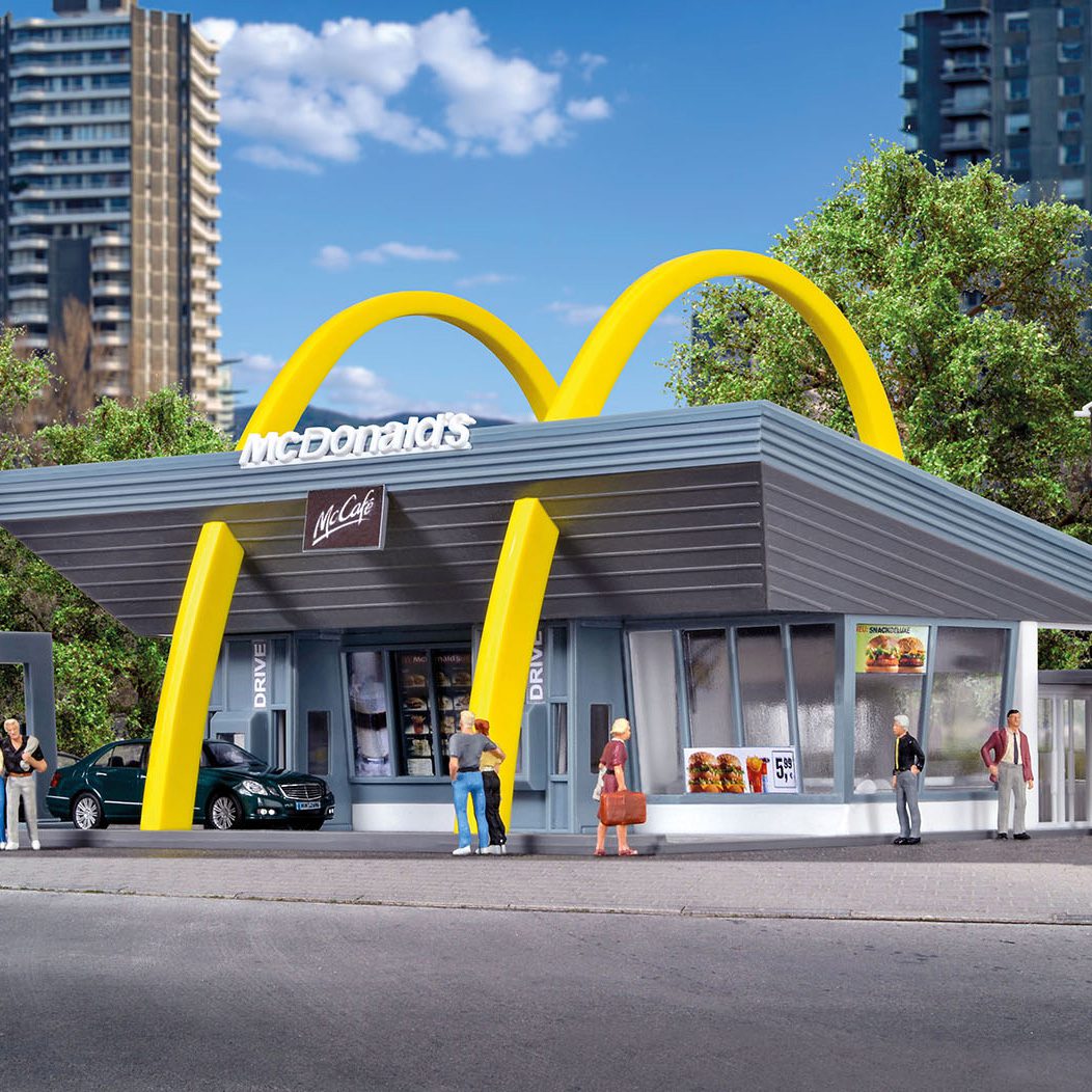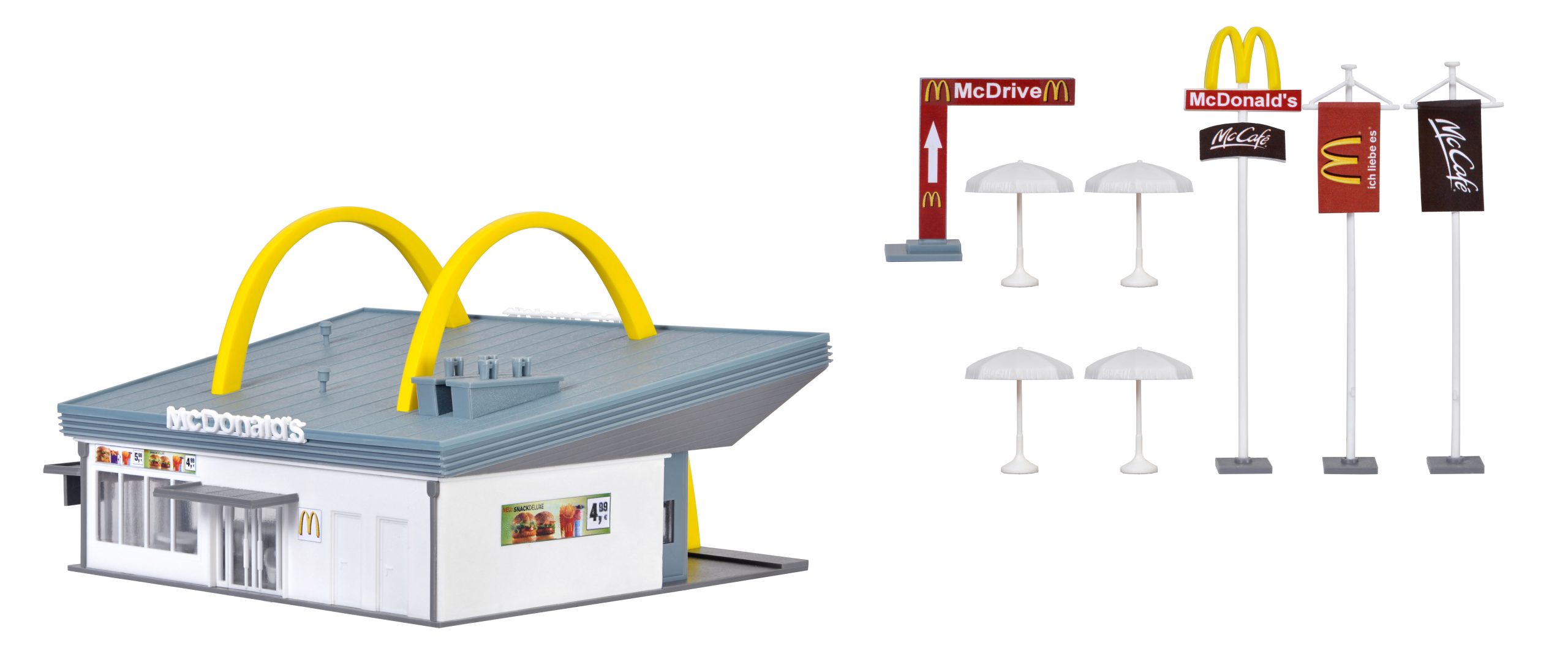 Together with McDonald’s Germany this model was developed and approved. Depending on the outside space McCafé area and/or a bigger restaurant area are offered. Flexibility even on your layout. We thank McDonald’s Germany for their support. With interior, 4 sunshades, 2 banners and mast with McDonald’s logo. Dimensions: L 17,5x W 16 x H 10 cm.