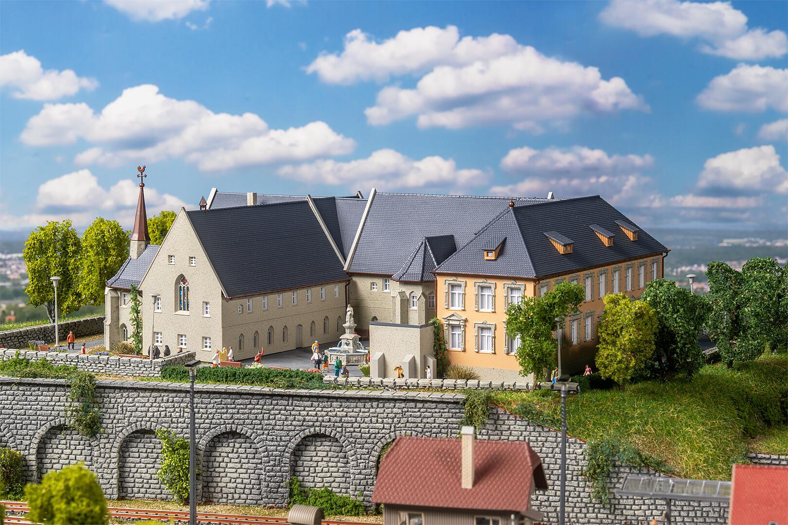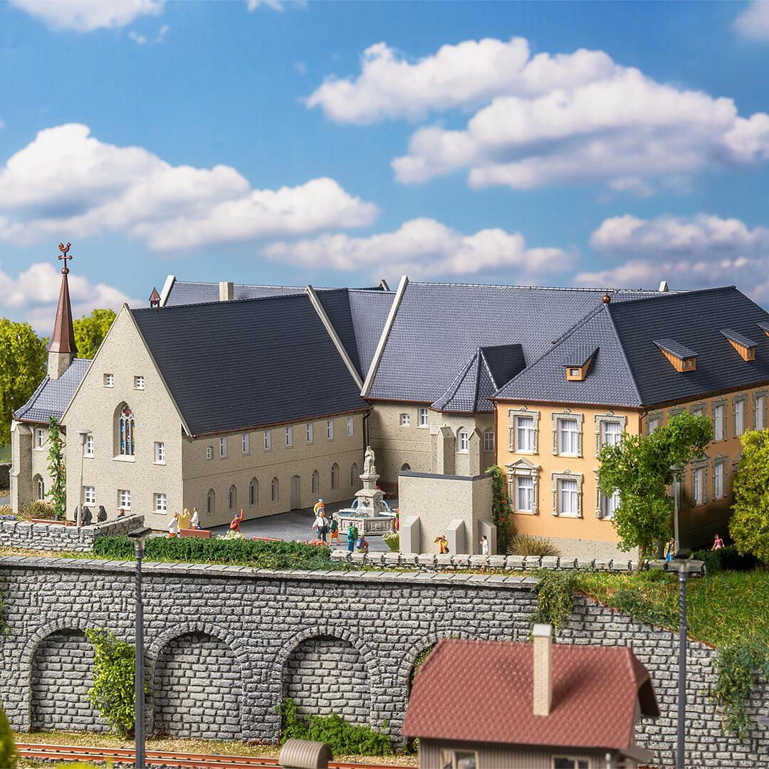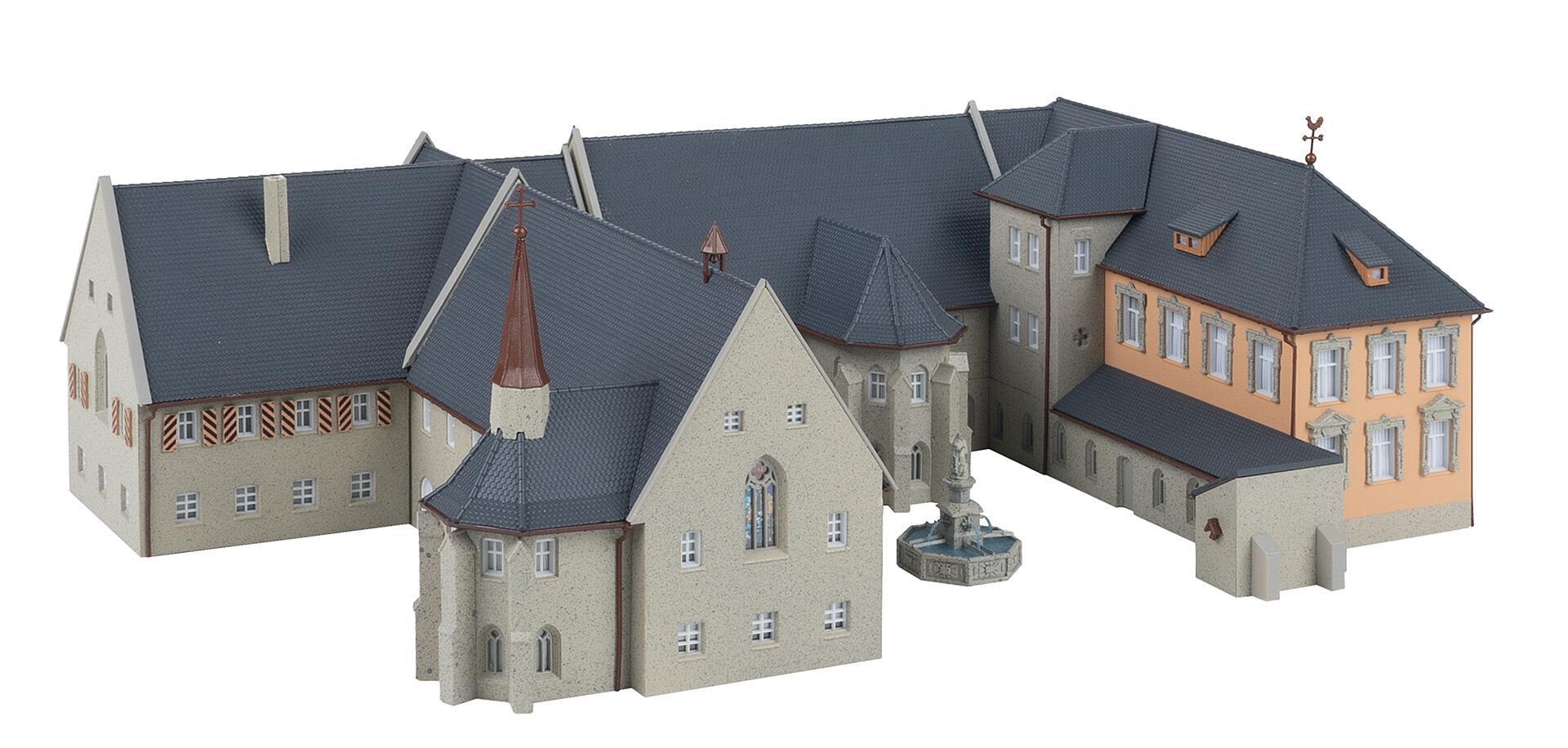 Sublime and full of stories! This lovingly designed abbey with its grey plaster and orange façade exudes the magic of past centuries. Playfully stiffened shutters, small turrets on grey-covered roofs and a stone fountain in the inner courtyard lend the building a romantic atmosphere. A historical gem for any model landscape – ideal for anyone looking for something special.