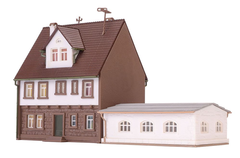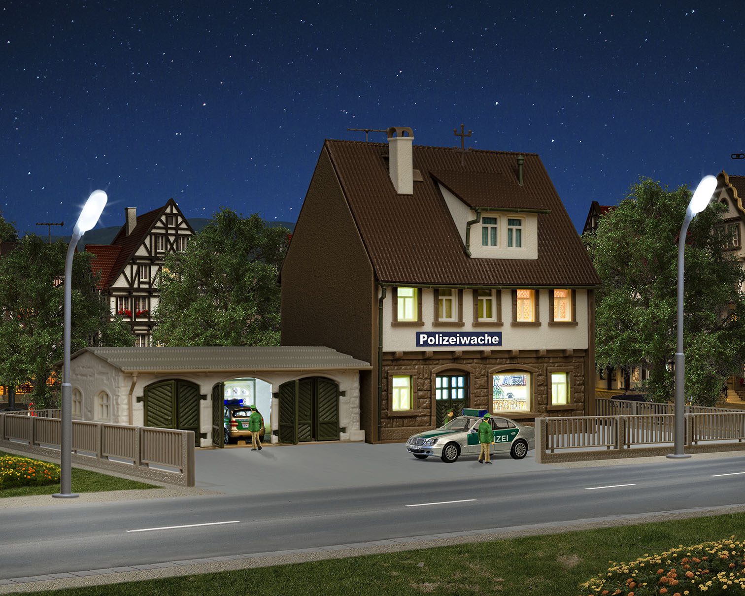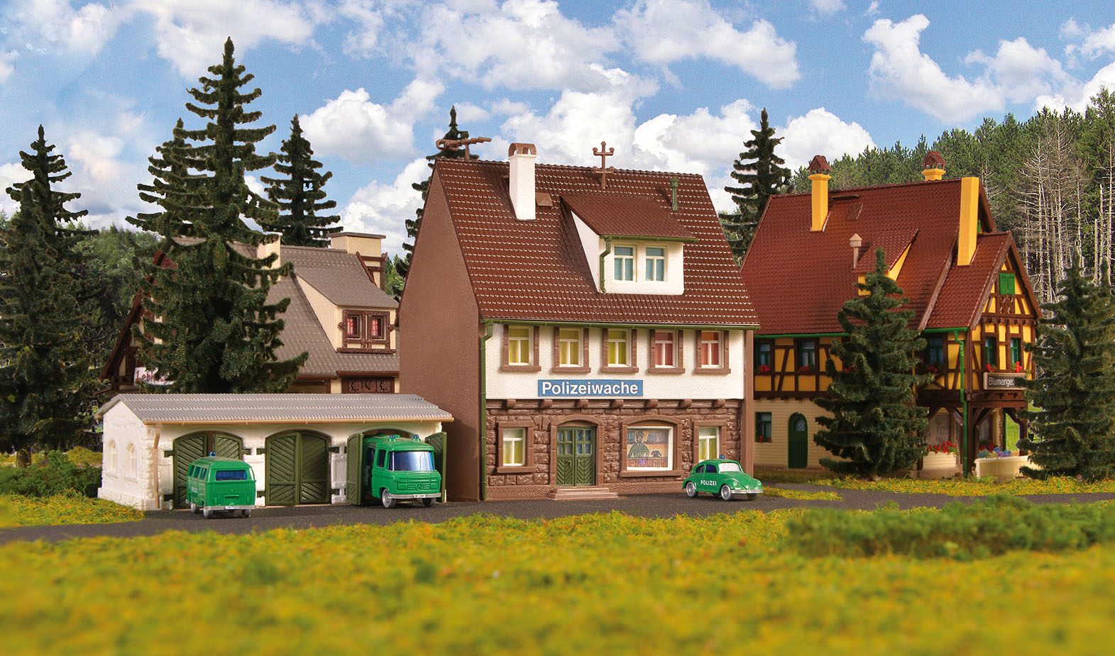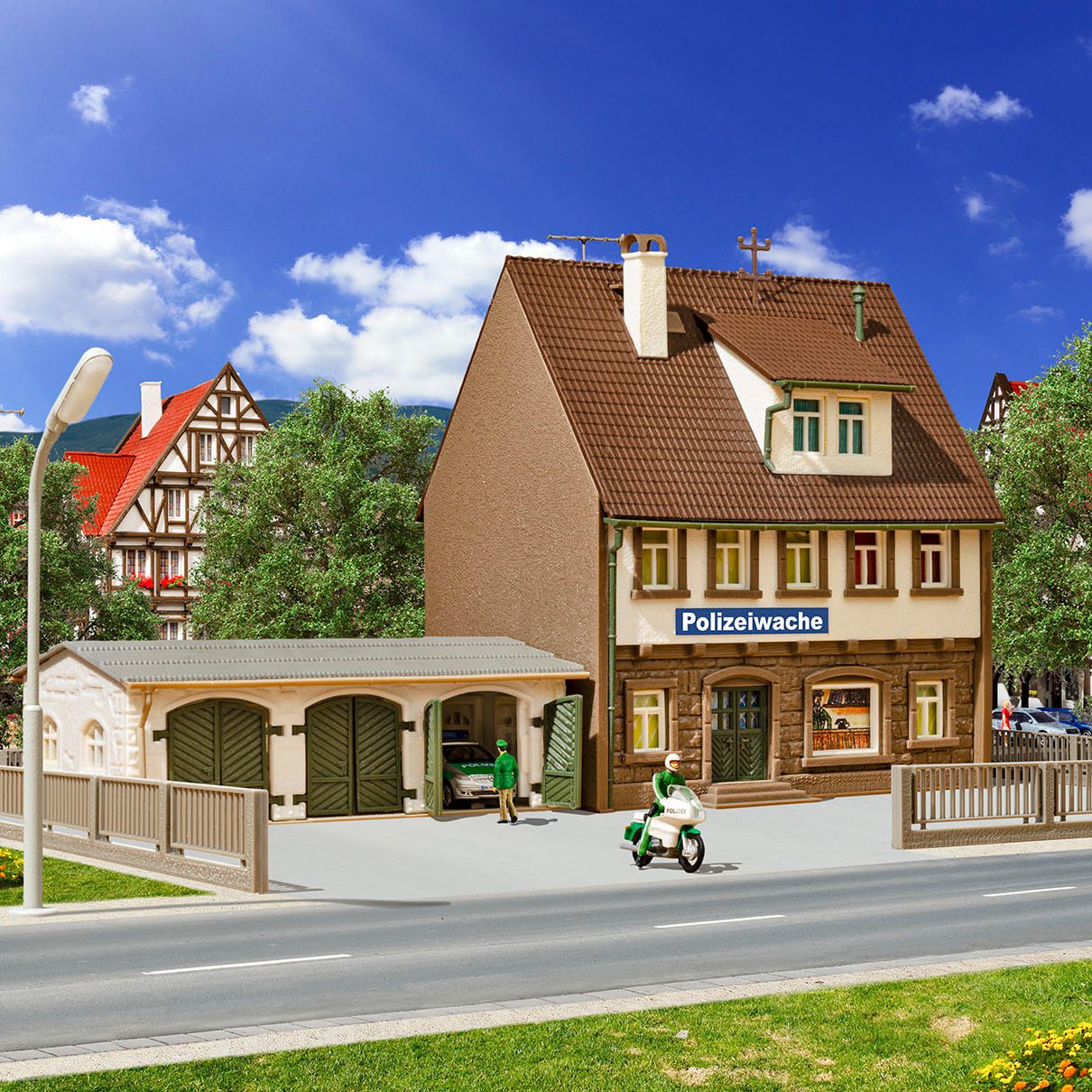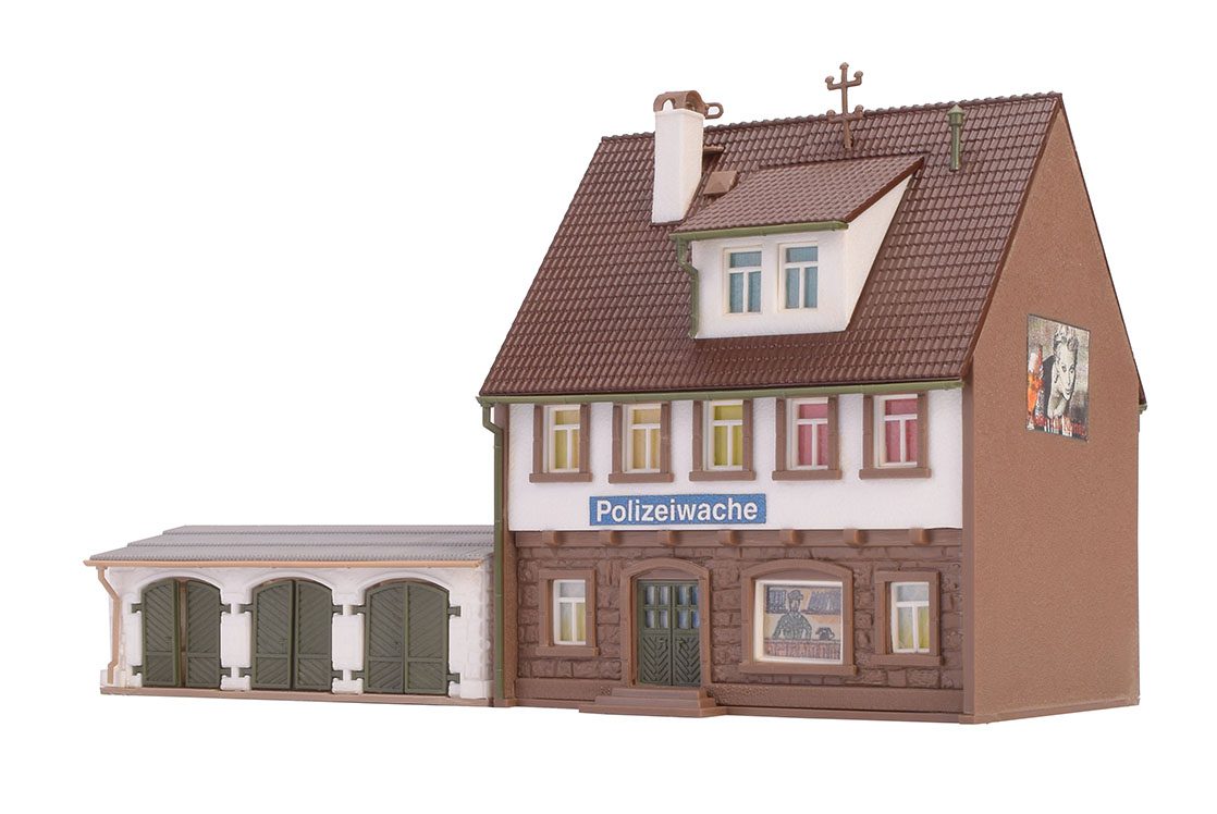 The police station is located in this two storeyed building in a provincial town. The garage annexe offers parking space for 3 fire brigade vehicles. Dimensions police station: L 8 x W 6,4 x H 9,3 cm. Garage: L 7,5 x W 6,2 x H 2,7 cm.