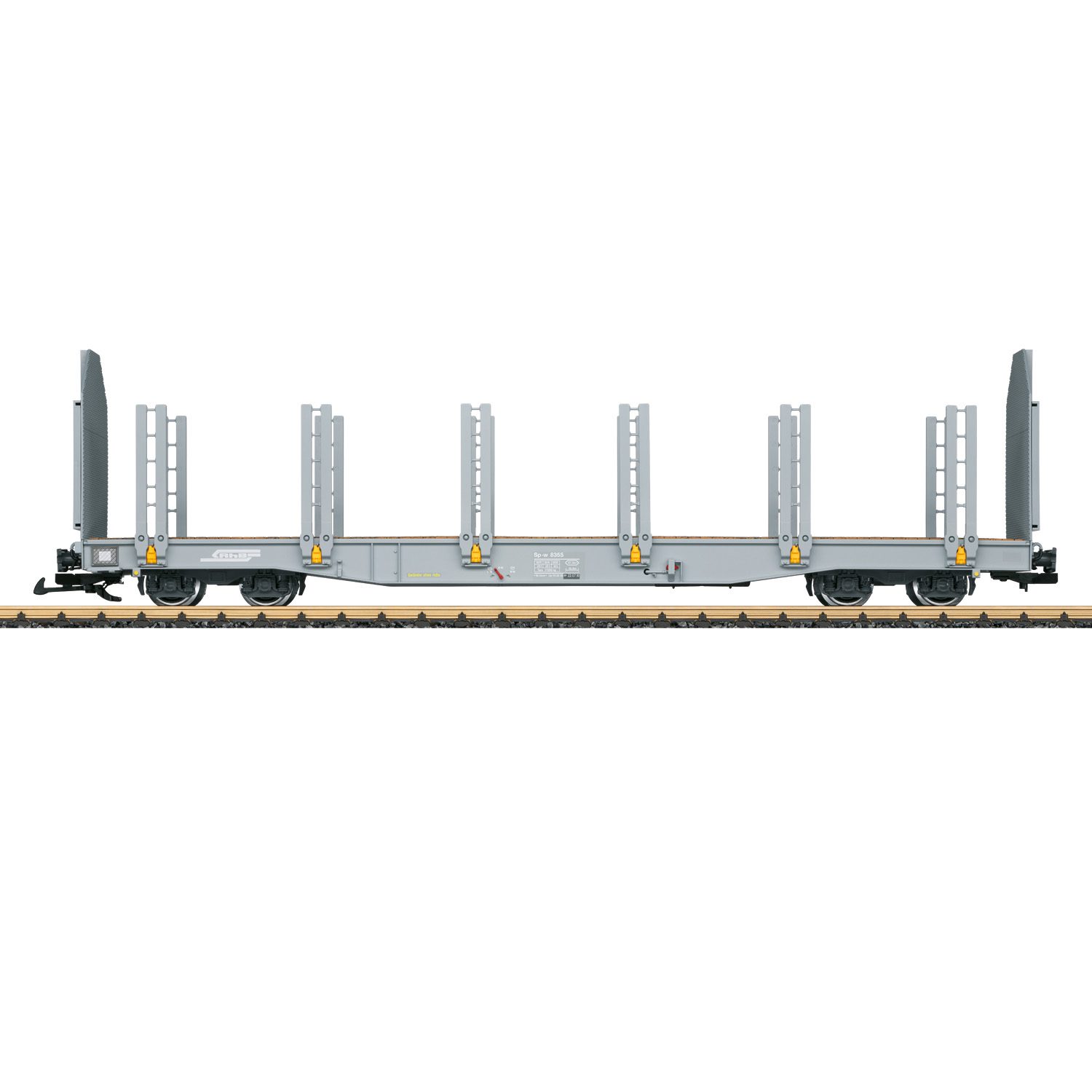 These flatcars with heavy double stakes are a customary sight on Rhaetian Railroad freight trains. They are used to transport chiefly heavy loads such as logs, steel beams, or pipe. These cars were built in the Nineties and are 16.54 meters / 53 feet 9 inches long over the buffers, weigh 17.6 metric tons empty, and can be loaded with 22 to 42 metric tons – depending on the type of train. There are separate end walls for special situations, which can be inserted in the stake holders on the buffer beams. The load can be secured front and rear. This is often done when loading very heavy and large diameter pipe.