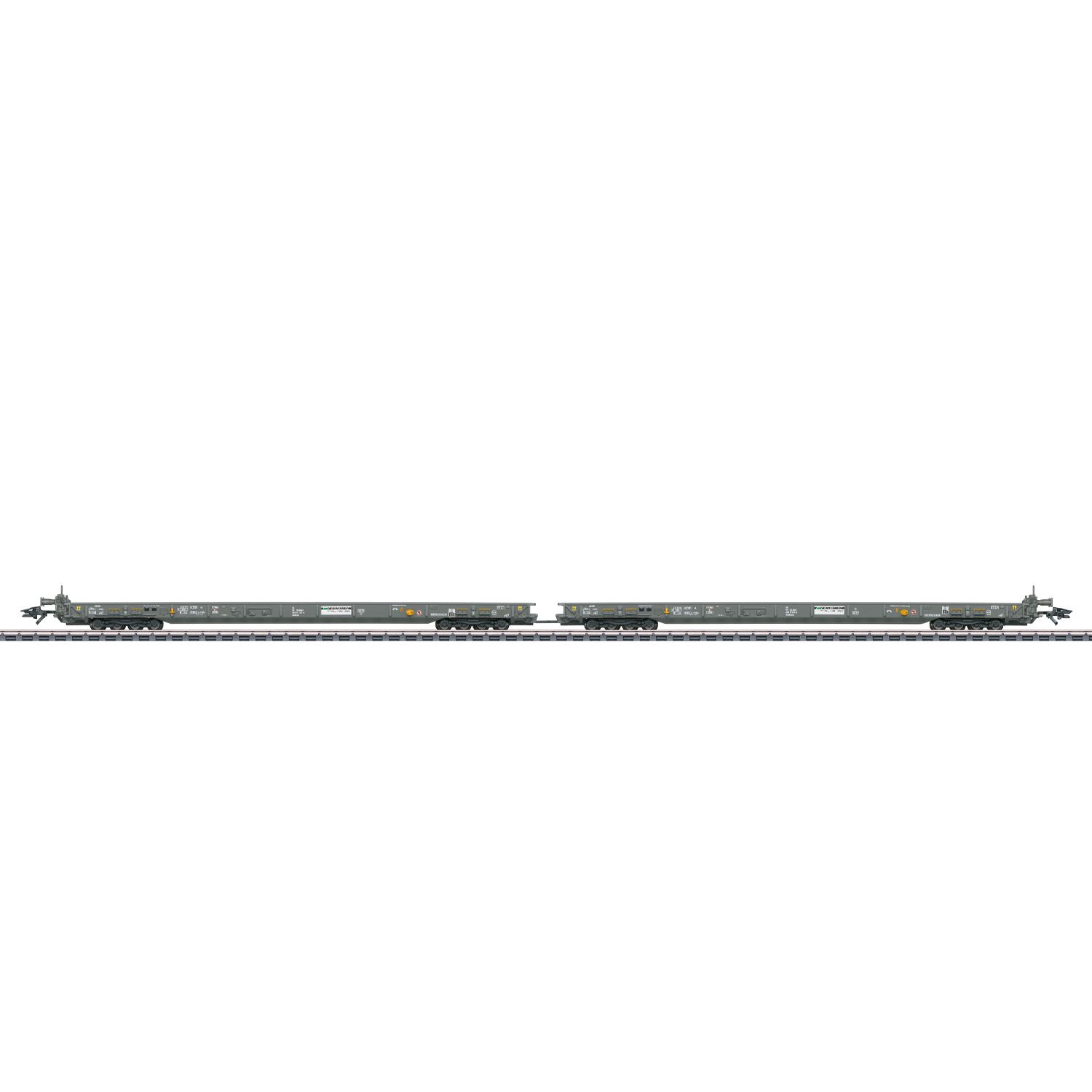 The cars have bodies constructed of metal. Each car has 2 hinged and removable buffer beams. Chock blocks for truck models and special couplers for depressed floor flat cars are included. Special close couplers for coupling to cars and locomotives with standard couplers are included. Both cars are packaged individually and there is a master package. Total length over the buffers approximately 44.6 cm / 17-9/16″.