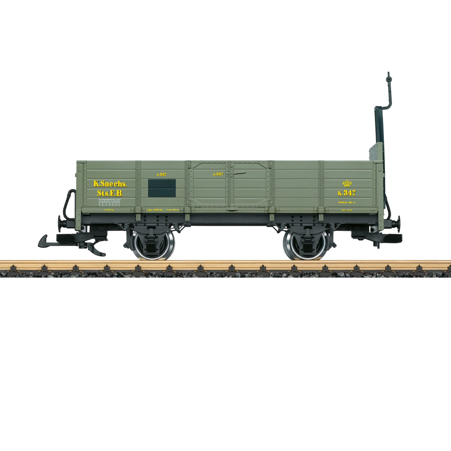 This is a Saxon type K 347 gondola for Era 1 and Era VI. The paint scheme and lettering are prototypical for the original car. The car belongs to the Dresden Transportation Museum and is currently located in Zittau. The car has metal wheelsets. Length over the buffers 30 cm / 11-13/16″.