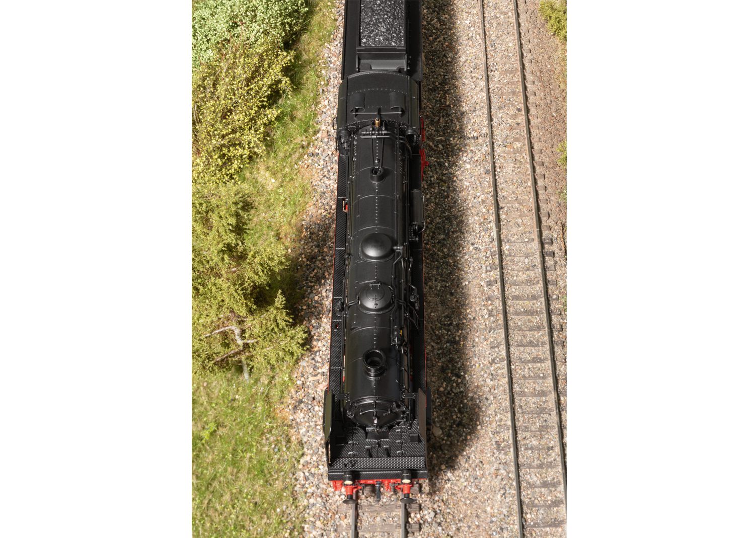 The locomotive has a digital decoder and extensive sound functions. It also has controlled, high efficiency propulsion with a flywheel in the boiler. 4 axles powered. Traction tires. The locomotive and tender are constructed mostly of metal. The locomotive has a factory-installed smoke unit with dynamic smoke exhaust geared to the locomotive’s speed. The locomotive has dual headlights that change over with the direction of travel, will work in conventional operation, and can be controlled digitally. The cab lighting and firebox flickering can be controlled separately in digital operation. Maintenance-free warm white and red LEDs are used for the lighting. Buffer capacitor included. The cab doors can be opened and there is an imitation of the curtains between the cab and the tender. There is a close coupling with a guide mechanism between the locomotive and the tender. There is a close coupler with an NEM pocket and a guide mechanism on the tender. The buffer height on the locomotive and tender conform to the NEM. The minimum radius for operation is R2 437.5 mm / 17-3/16″. Piston rod protective sleeves and brake hoses are included.