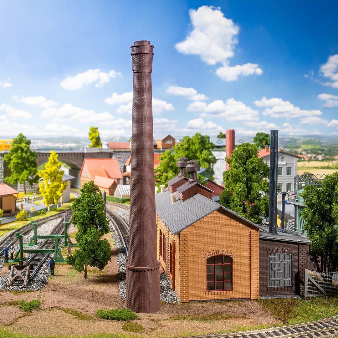 An imposing, rust-red industrial chimney made of bricks rises up on the model layout – the ideal detail to give a factory the authentic, rustic atmosphere and typical industrial charm.