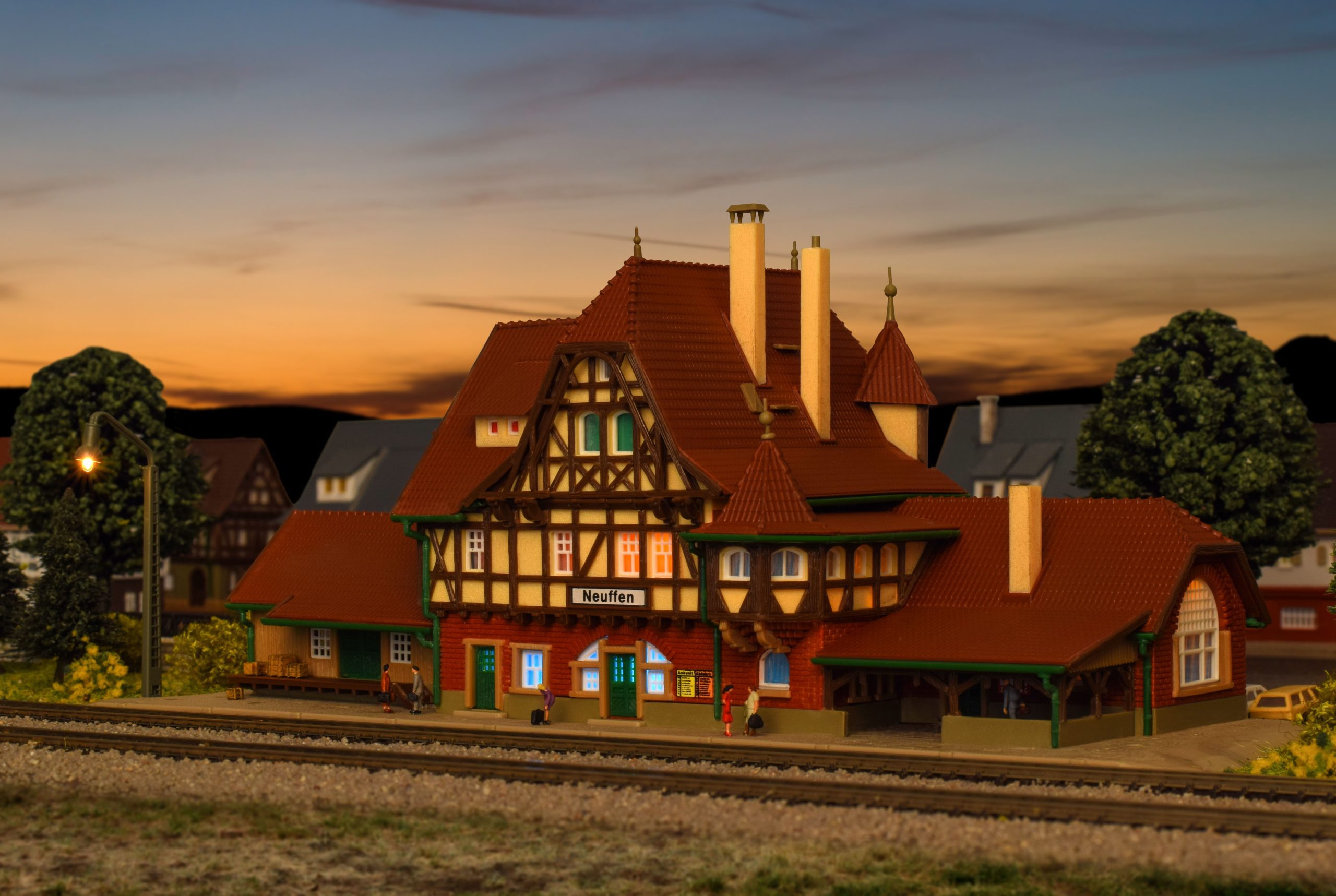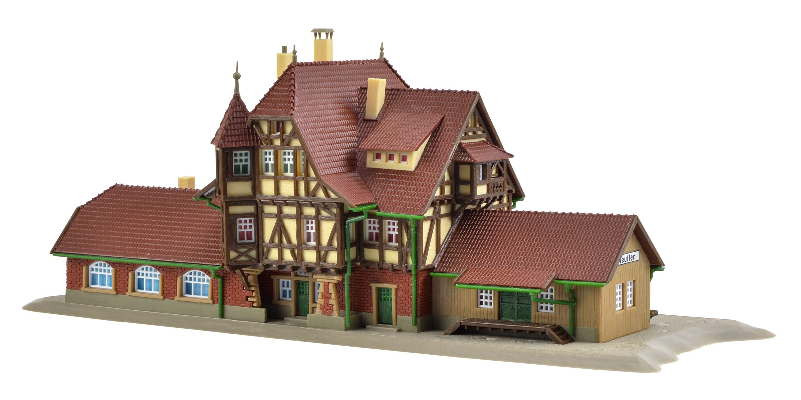 A typical country station. Terminus of the side line Nürtingen-Neuffen, close to the castle ruin Neuffen. The original was built end of 20th century and the Vollmer model shows all the details perfectly. Dimensions: L 22 x W 7,5 x H 8 cm.