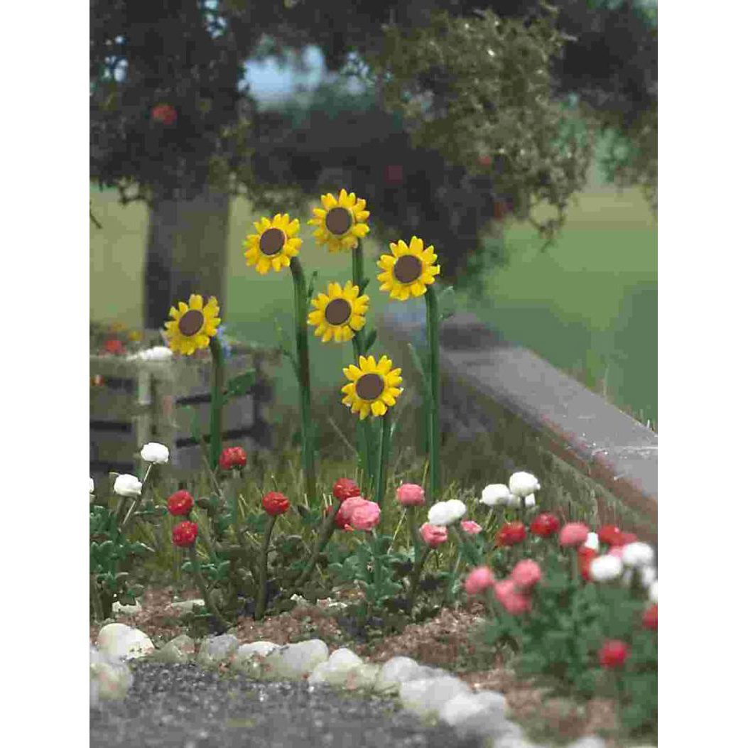 12 sunflowers (yellow) and roses (white and red) mounted on base plates. Also included: fountain. Packaged in a transparent presentation box.