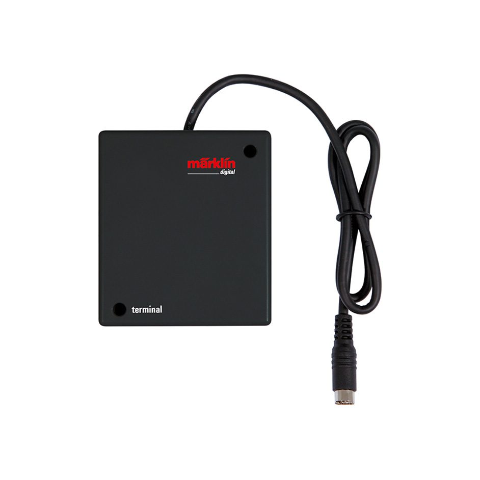 Connections can be made for additional devices from the digital program to the Central Station. The unit has a permanent 9-conductor connecting cable, 60 cm / 23-5/8″ long (can be extended with 60126) and a 9-pin socket for another Terminal or for other devices to the main line. Four (4) 7-pin sockets for connections from the Mobile Station (60124 adapter cable necessary) or other peripheral devices. Dimensions 96 x 85 x 40 mm / 3-3/4″ x 3-3/8″ x 1-9/16″.