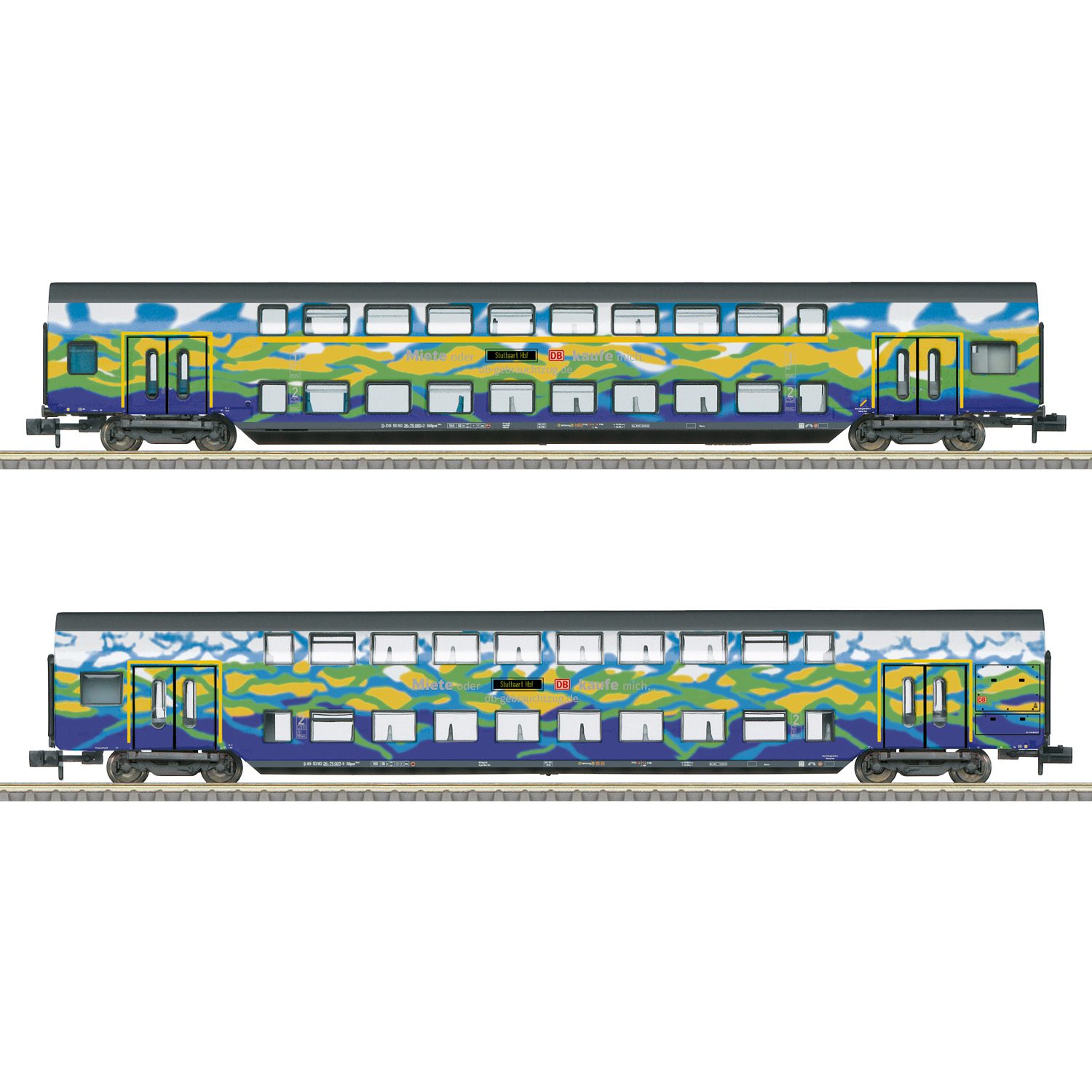 1 x type DBpza 753.5 bi-level intermediate car and 1 x type DABpza 758.5 bi-level intermediate car of the German Federal Railroad (DB AG), operated by DB Used Train. The cars look as they currently do in era VI.
