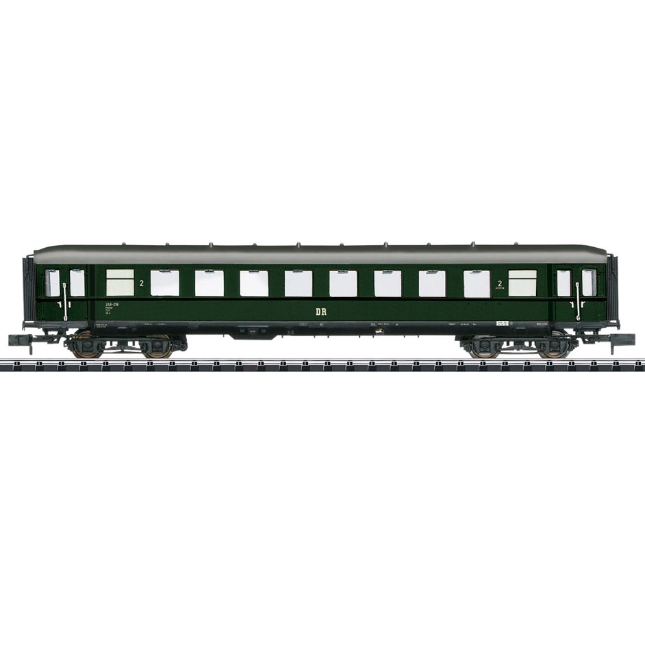German State Railroad (DR/GDR) type B4ümpe limited stop fast train car, 2nd class, streamlined design in a bottle green paint scheme. The car looks as it did around 1959.